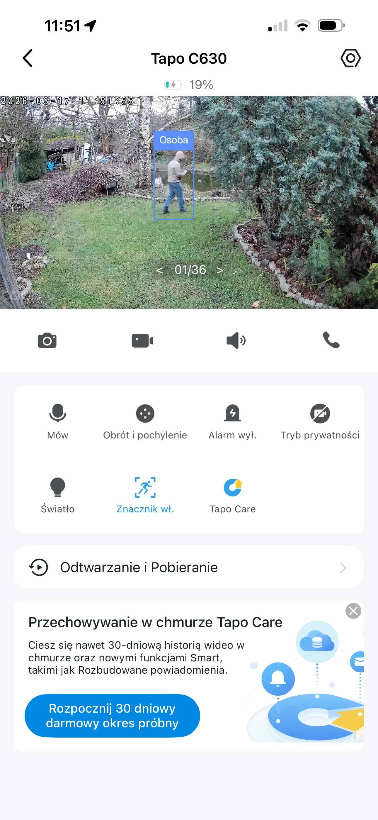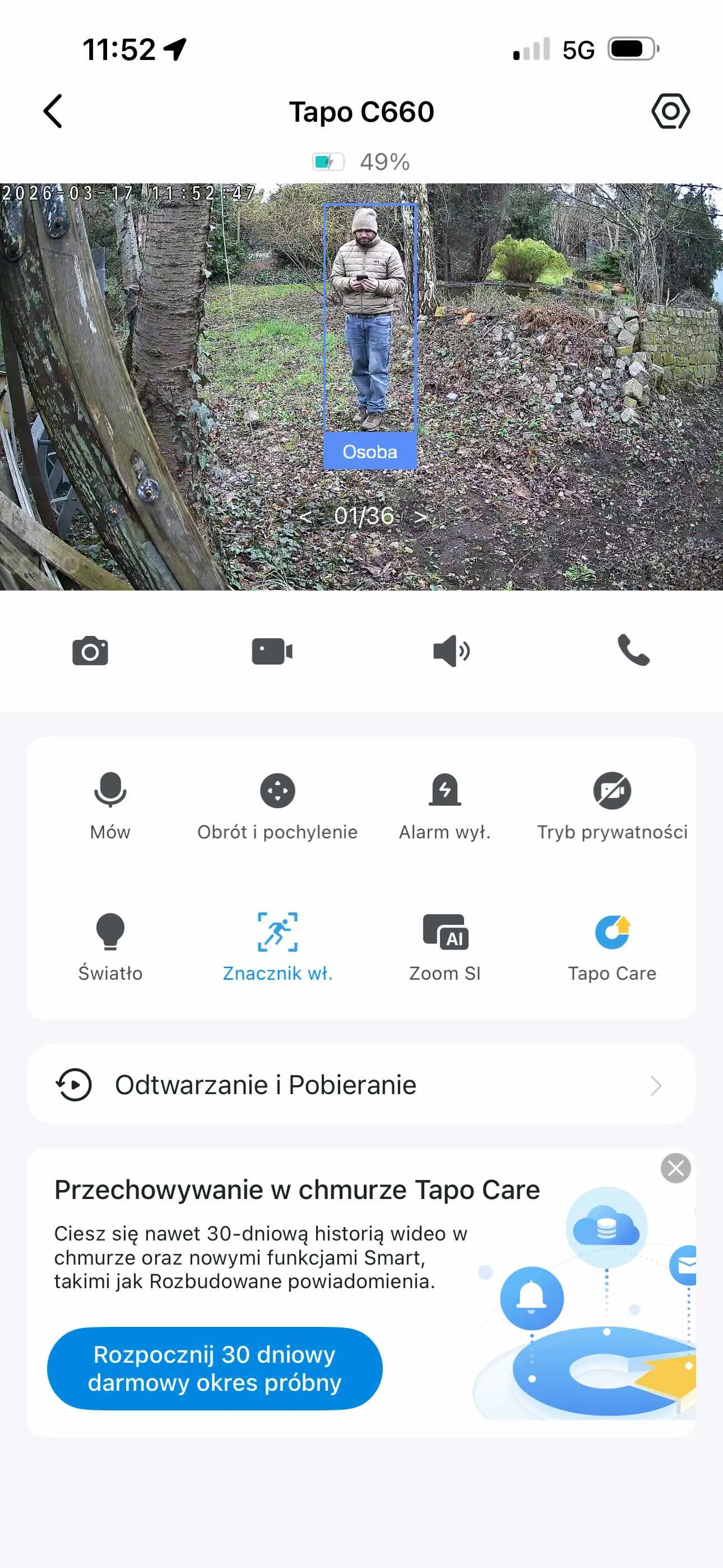 Tak się jednak nie dzieje, bo C660 po prostu podąża za mną obiektywem i to w niemal dowolnym zakresie. Już nawet tutaj, na poniższym zrzucie ekranu, standardowo byłbym poza zasięgiem kamery. Jestem jednak w centrum kadru i mógłbym pójść jeszcze dalej i dalej, gdyby nie to, że zaraz kończy mi się działka.