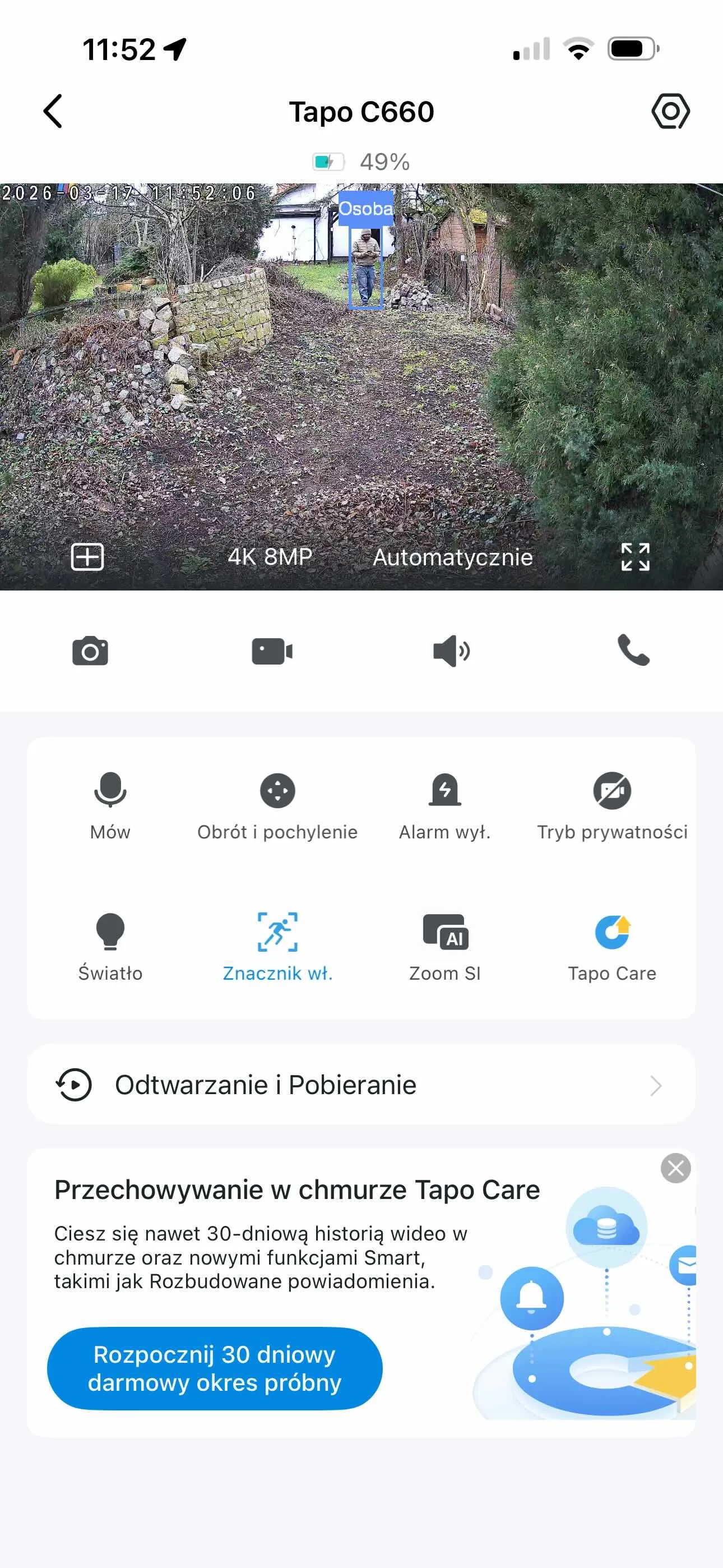 Tapo C660 zaoferuje nam bez wątpienia lepszy, bardziej szczegółowy, a do tego - opcjonalnie - bardziej płynny obraz. O ile bowiem C630 to maksymalnie 2880 x 1620 pikseli i 15 klatek, o tyle C660 to już 3840 × 2160 pikseli i 20 klatek na sekundę, uzupełnione - dzięki wyższej rozdzielczości - o większy zakres cyfrowego przybliżenia bez "pikselozy". Z drugiej strony - już to 3K w C630 jest naprawdę przyjemnej jakości i nie widzę powodu, żeby na to narzekać. Tym bardziej, że moje prywatne ogrodowe kamery (też zresztą Tapo) oferują 2K i... są więcej niż wystarczające.
