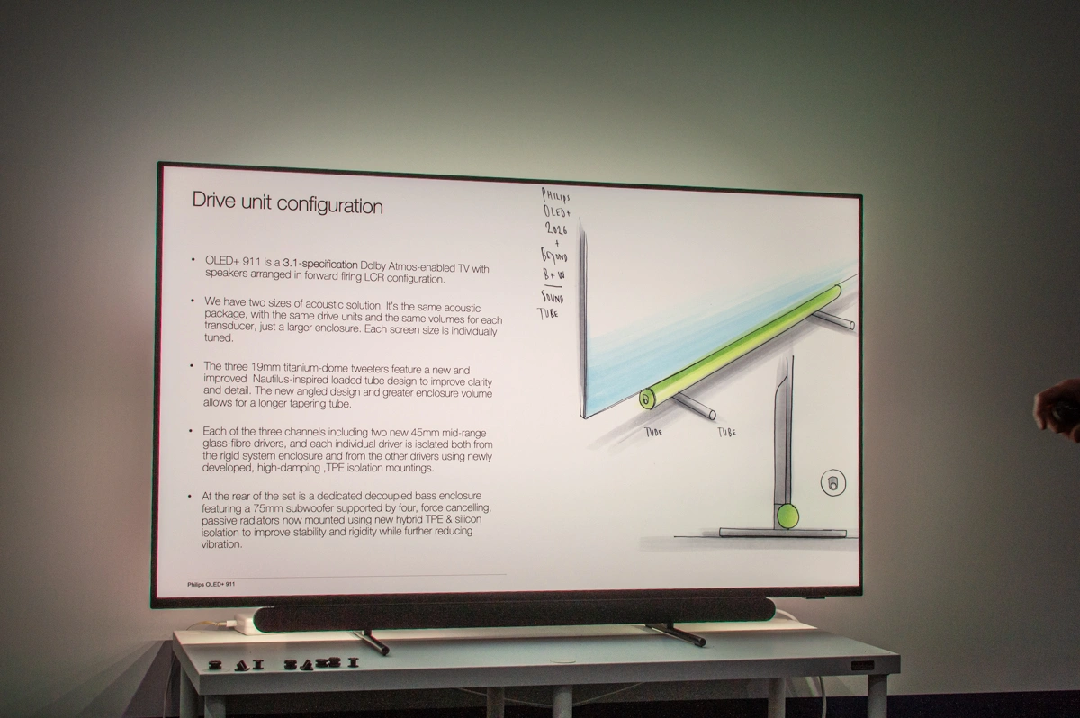 OLED+911 idzie w zupełnie inną stronę. Pod ekranem znajduje się pełnoprawny system Bowers & Wilkins 3.1, z dedykowanymi przetwornikami średniotonowymi, tytanowym tweeterem i odsprzężoną obudową basową z tyłu. Całość ma 81 W mocy i jest zaprojektowana tak, by grać szeroko, czysto i dynamicznie.
