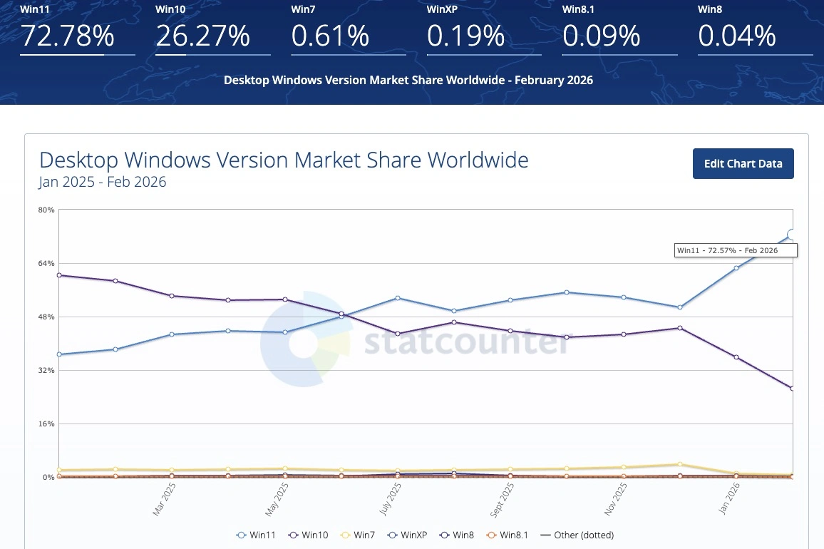 Z danych StatCounter z lutego 2026 r. wynika, że Windows 11 działa na 72,78 proc. wszystkich komputerów z systemem Microsoftu. To obecnie znaczna część rynku - liczba w porównaniu z poprzednim miesiącem wzrosła aż o 10,37 punktów procentowych. W poprzednich miesiącach jedenastka również znacząco zyskiwała na popularności: