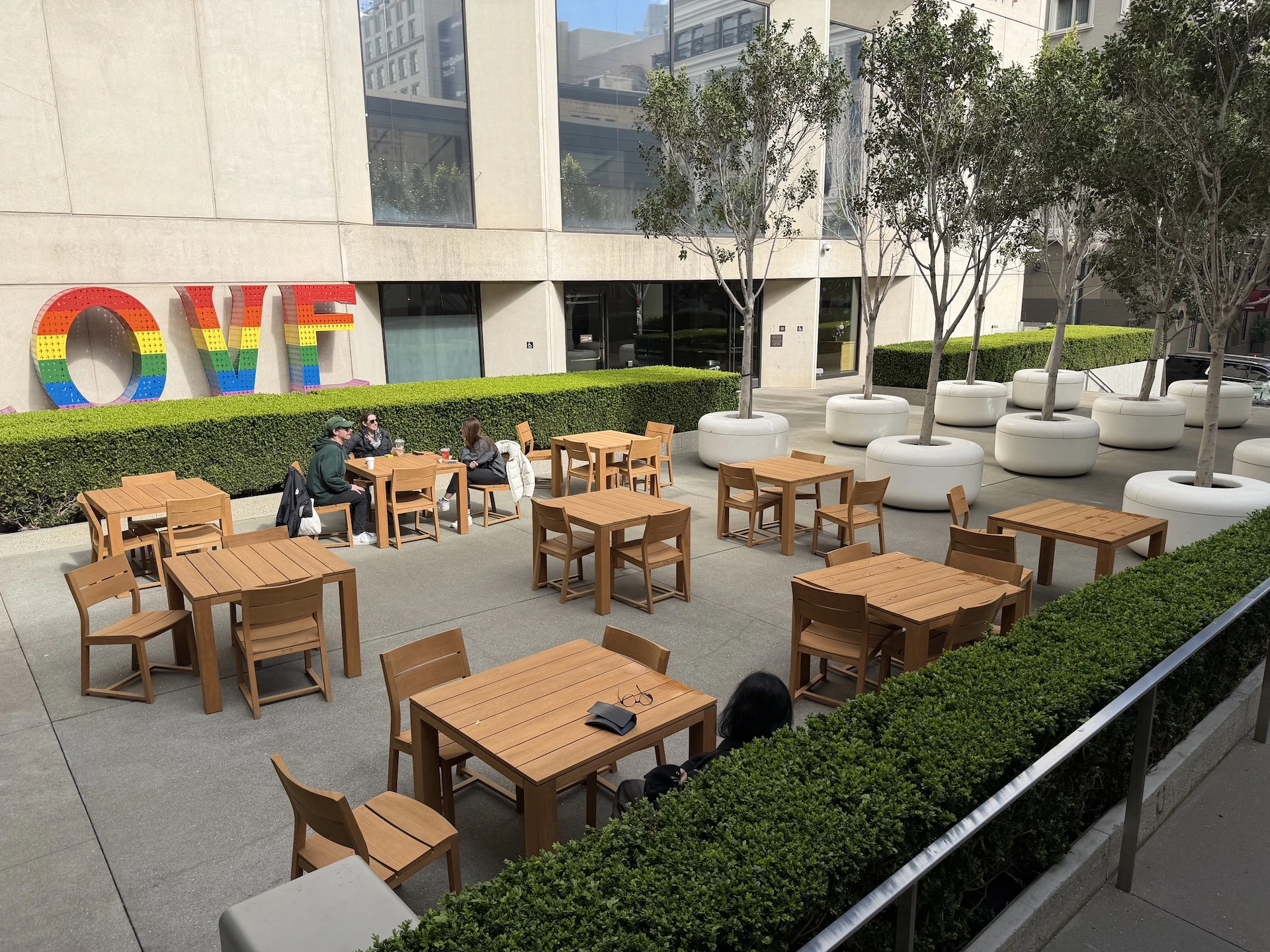 Pytam się pracownika obsługi mającego oko na przestrzeń pod chmurką, czy każdy może sobie tutaj usiąść. Jak najbardziej. Chociaż formalnie jest to grunt Apple, nikt nie patrzy spod byka na osoby chcące popracować tu na laptopie, nawet długie kilka godzin.