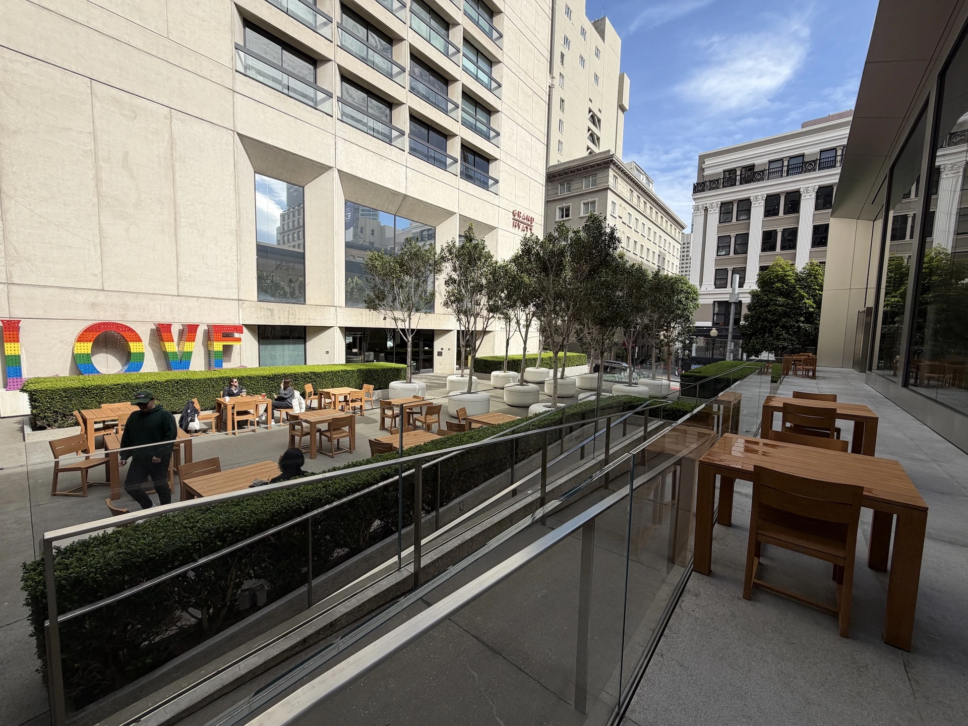 Praktyka okazała się zupełnie inna. Kiedy zapytałem, jaka jest rola tej przestrzeni, pracownik Apple Store wyznał: ludzie przychodzą tutaj podładować telefon, spojrzeć na Union Square, przeczekać ulewę. Rewelacyjny widok zlokalizowany na piętrze, połączony z miejscami siedzącymi oraz gniazdami i przewodami zasilającymi faktycznie sprawia, że człowiek ma ochotę zostać na dłużej.
