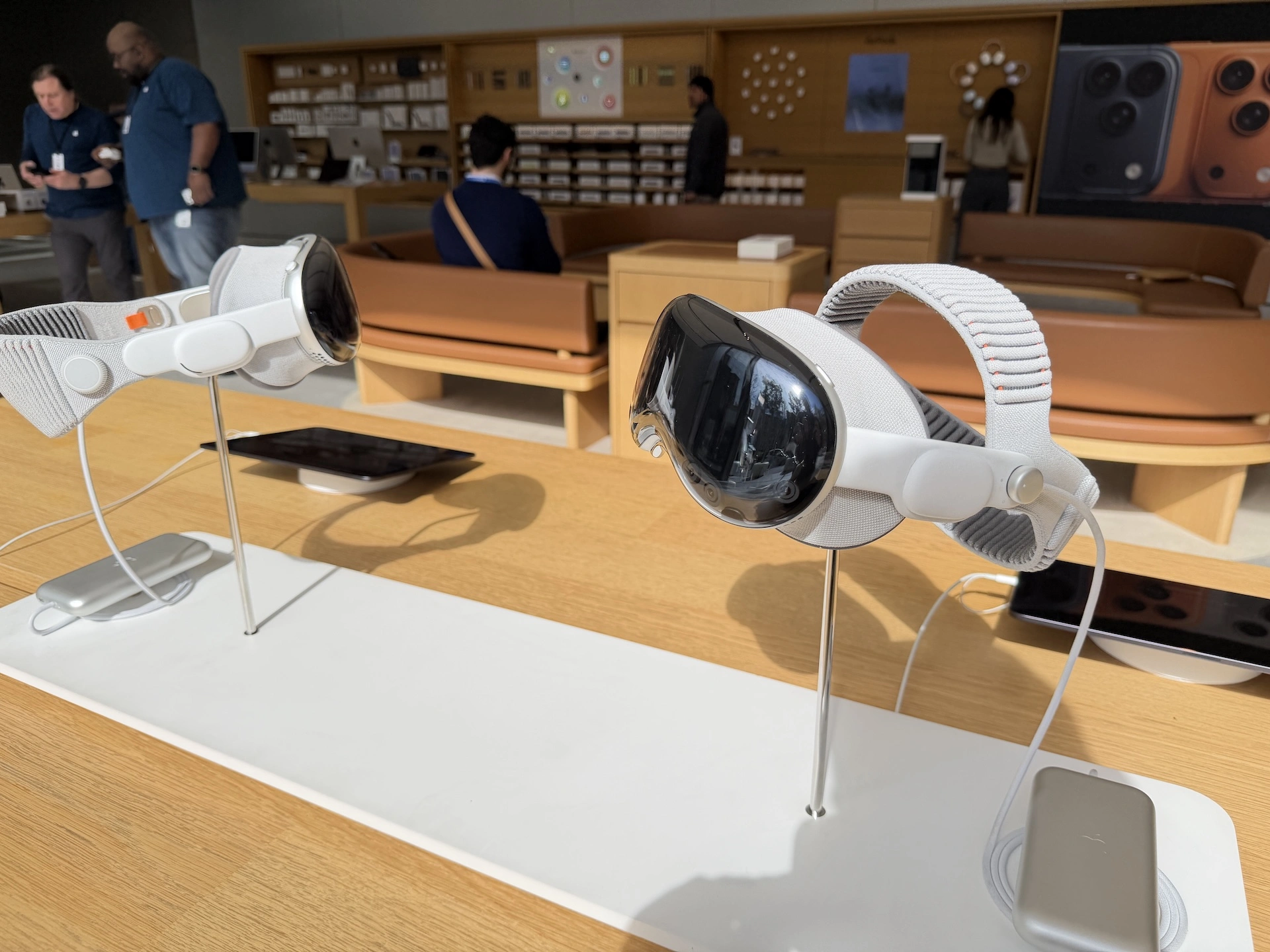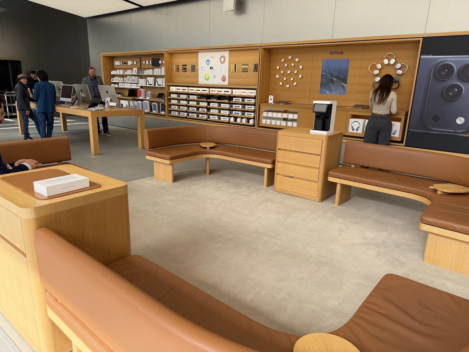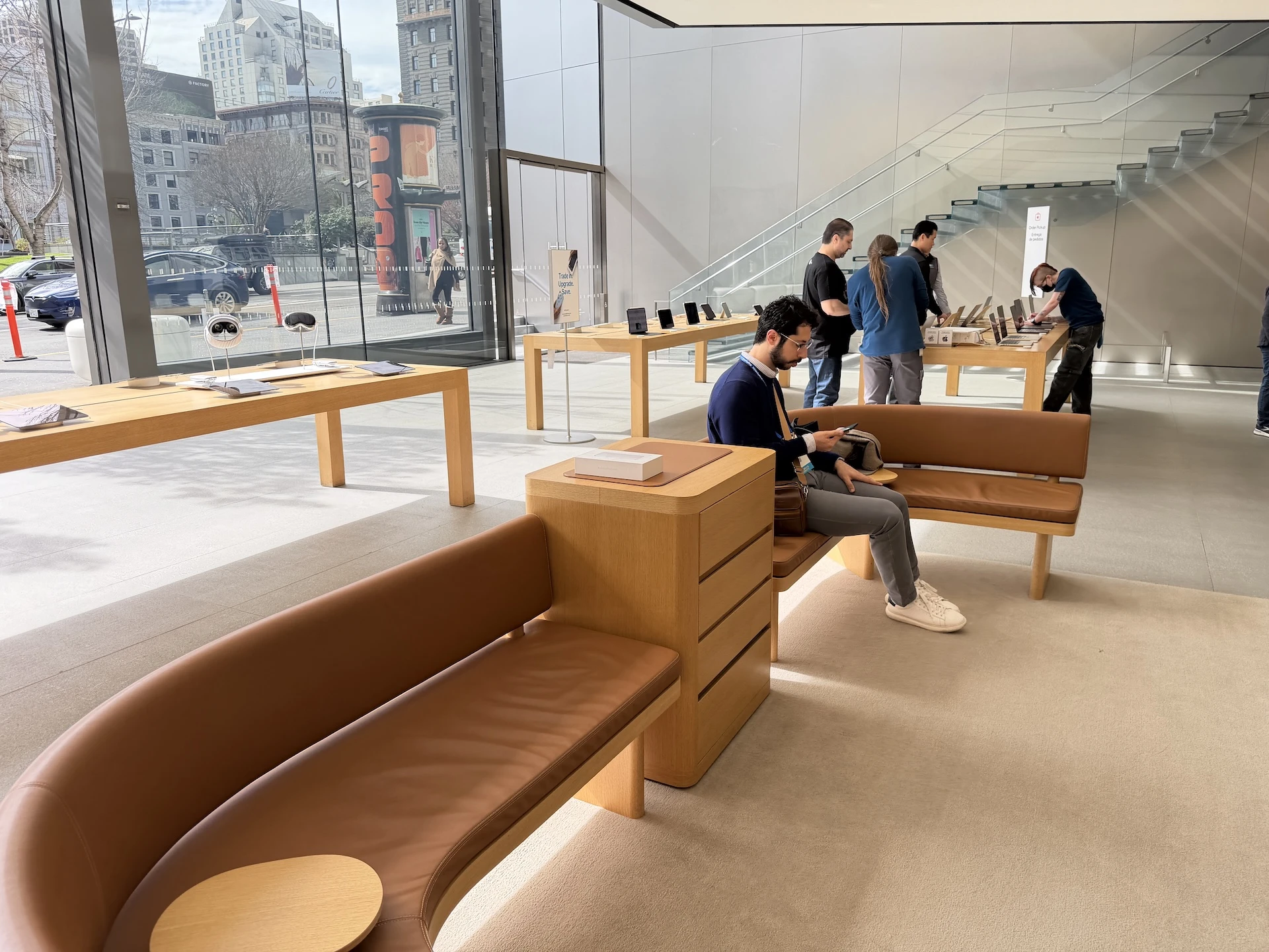 Obite skórą szerokie ławy. Miękkie fotele. Podłokietniki na ręce, książki i telefony. Miejsce bardziej przypomina lożę biznesową na lotnisku niż sklep. Nie ma w tym przypadku. Po chwili obserwacji widać jak na dłoni, że przestrzeń zaaranżowano w ten sposób, aby odwiedzający testowali Apple Vision Pro. Mają wygodnie siedzieć, machać rękoma i czuć się jak u siebie.