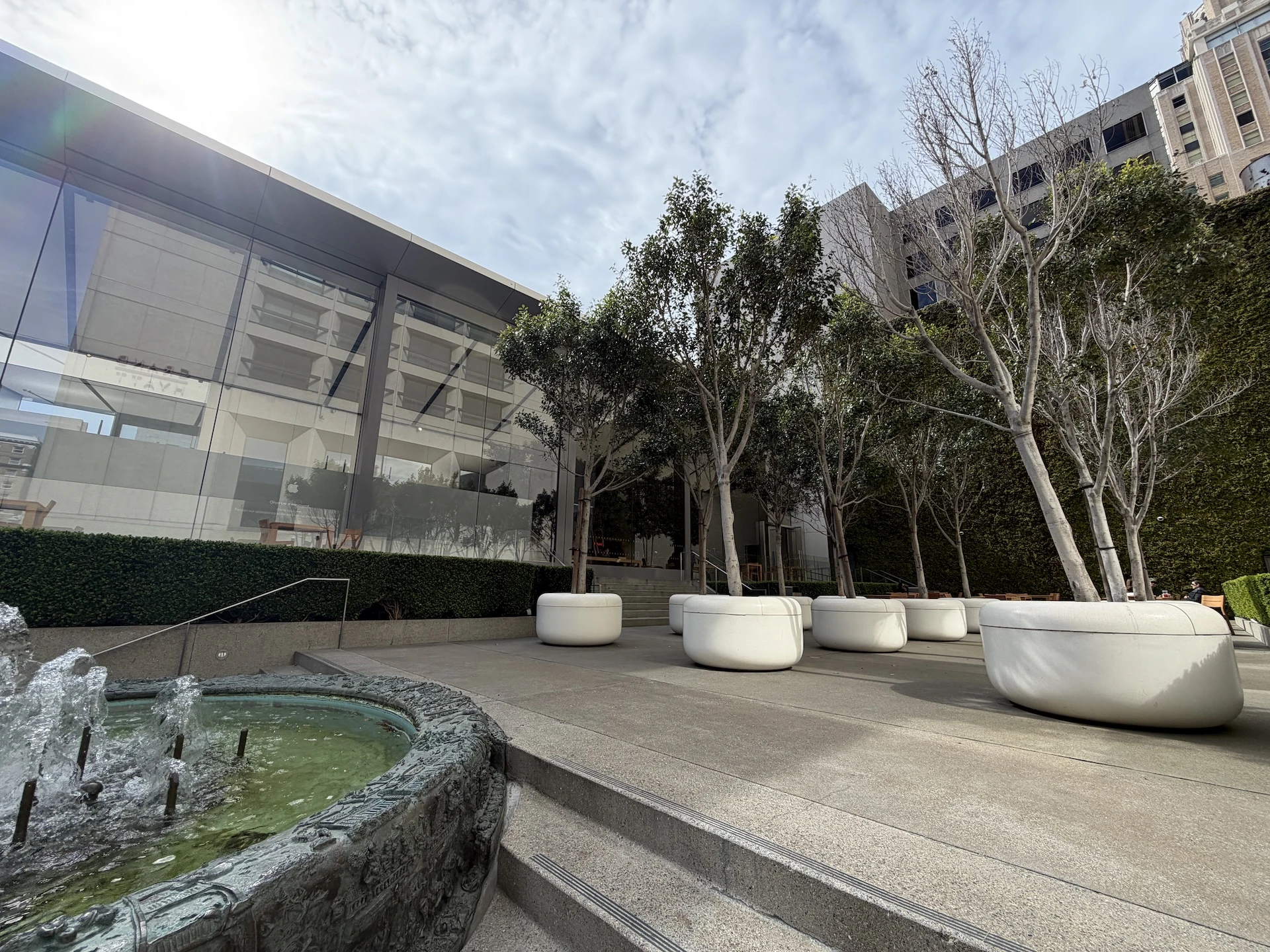 Integralną część kalifornijskiego Apple Store stanowi przestrzeń wyglądająca jak parkowa strefa wypoczynkowa. Taka na bogato, z dużą liczbą zieleni oraz stolików z krzesłami. Zadbanym drzewkom towarzyszą nienagannie przycięte żywopłoty, a ściana sklepu zapewnia kojący cień. Nic tylko usiąść z książką albo laptopem.