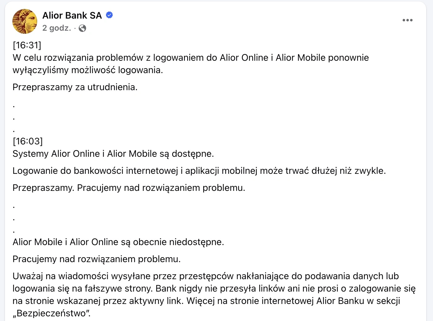 O godz. 16:31 zaktualizowano status i poinformowano, że w celu rozwiązania problemów z logowaniem do kont bank ponownie wyłączył możliwość logowania się. Mimo tego ok. godz. 18:00 problemy wciąż występują. W odpowiedzi na komunikat wielu klientów Alior Banku twierdzi, że w dalszym ciągu nie ma dostępu do konta zarówno przez aplikację mobilną, jak i serwis internetowy.