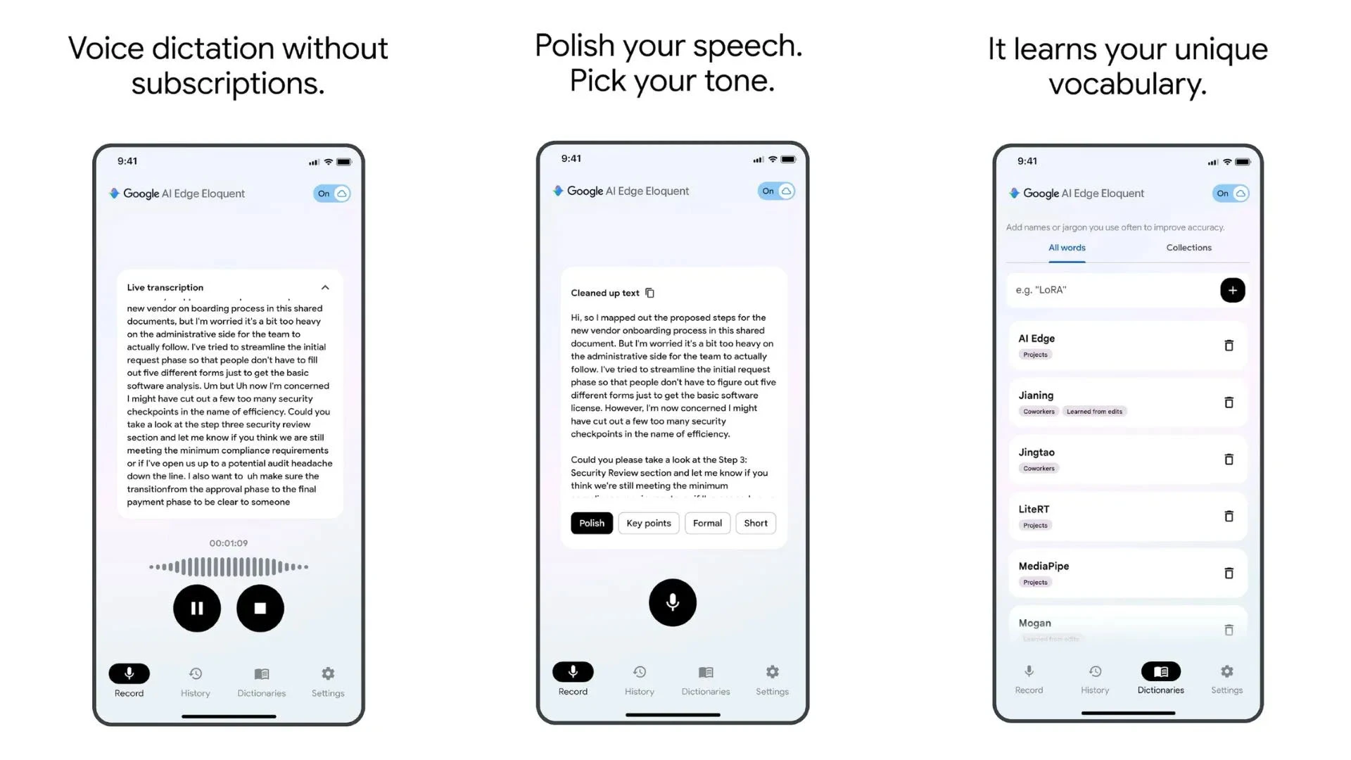 Na pierwszy rzut oka Google AI Edge Eloquent może wyglądać jak jedna z wielu aplikacji do zamiany mowy na tekst. Jednak różnica ma polegać na tym, że równolegle z transkrypcją Google AI Edge Eloquent prowadzi korektę tekstu, poprzez m.in. usuwanie "zawieszeń" takich jak "yyyy", "eeee", poprawianie błędów językowych czy dokładanie odpowiedniej interpunkcji.
