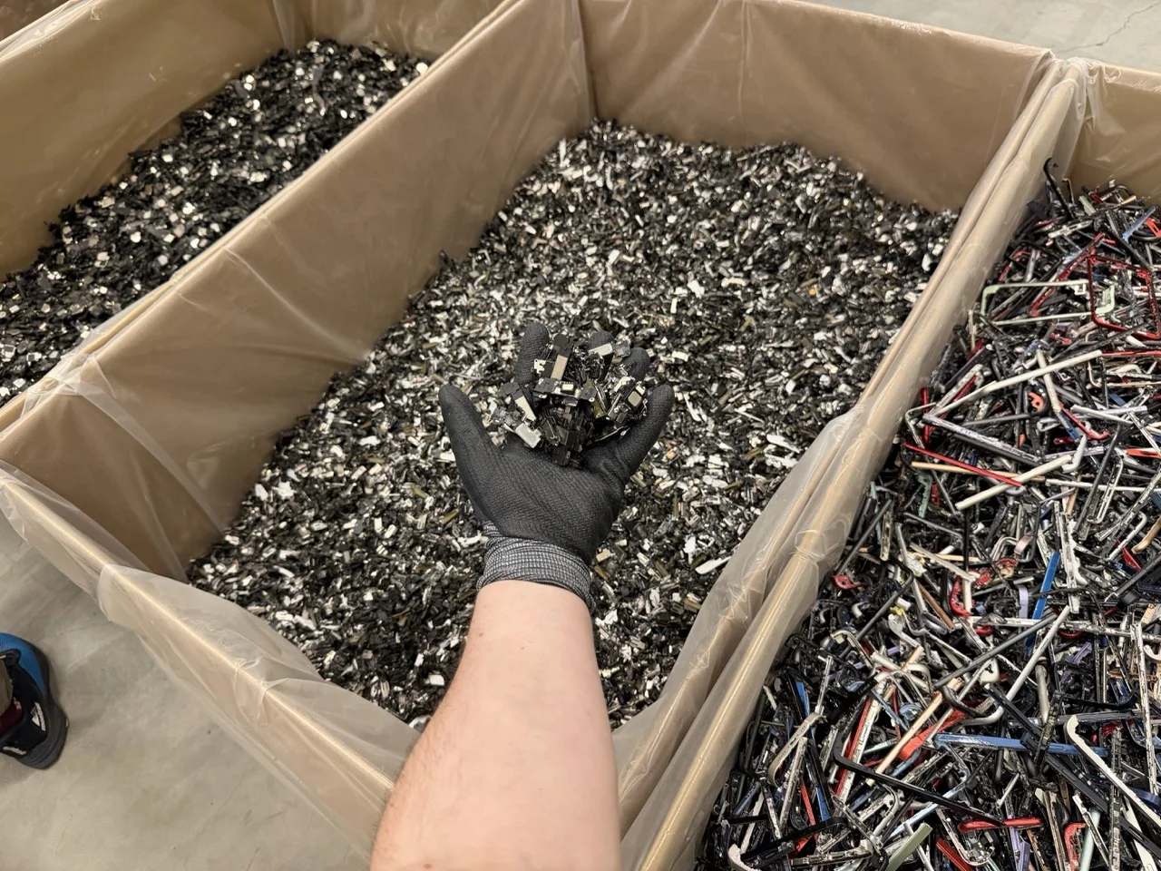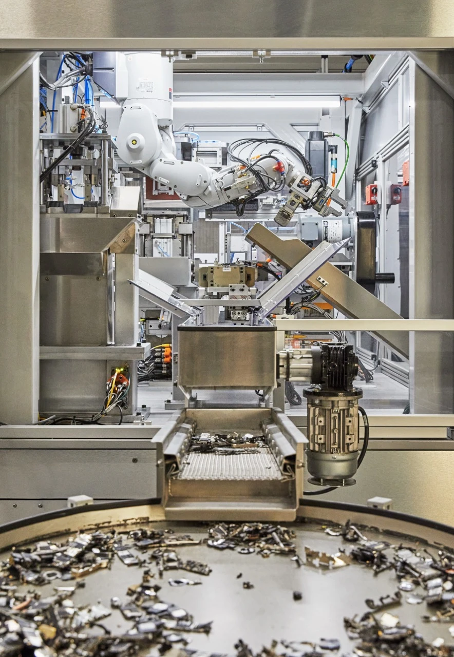 Ten usuwany jest zaraz w kolejnym kroku, gdyż kolejne robotyczne ramię przyciska telefon czegoś przypominającego piankę, co wyciąga ogniwo zasilające ze środka. To spada z głuchym hukiem do umieszczonego niżej wiaderka na szynie, w którym to wyjeżdża sobie poza maszynę, by pierwszy z operatorów mógł przełożyć je do większego pojemnika pełnego akumulatorów, które mogą być dzięki temu procesowane dalej. Na tym oczywiście cały proces się oczywiście nie kończy.