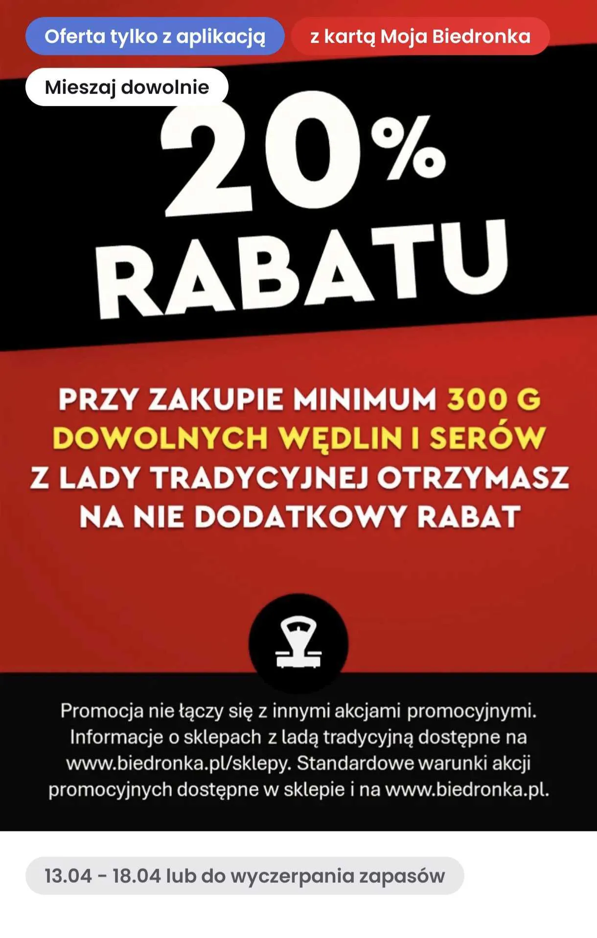 Zaczęło się w weekend, kiedy to promocja na szynkę wieprzową aktywna była wyłącznie dla użytkowników aplikacji. Od 13 do 18 kwietnia korzystający z programu Biedronki mogą liczyć na 20 proc. rabat "przy zakupie minimum 300 g dowolnych wędlin i serów z lady tradycyjnej". Jak zaznacza sklep, to oferta "tylko z aplikacją".