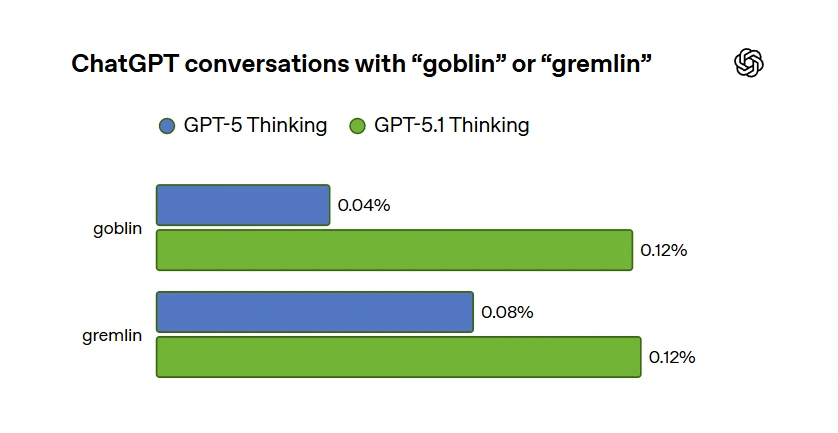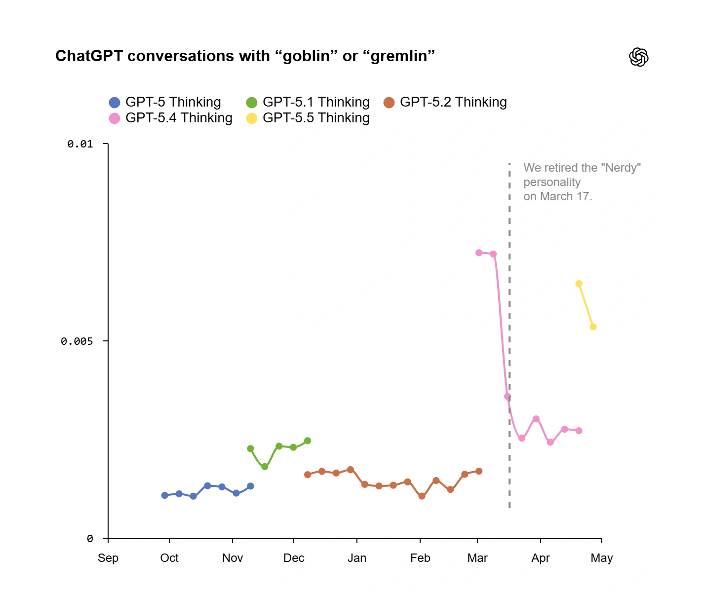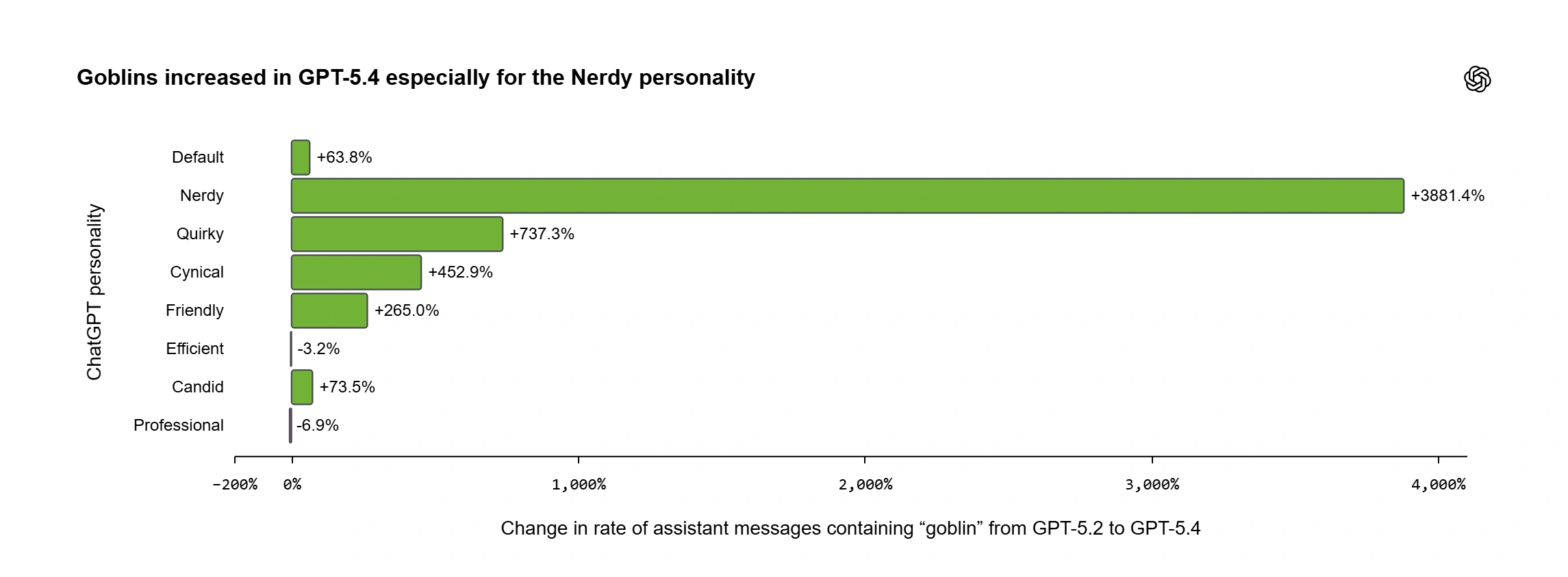 Na tym etapie nie wyglądało to jeszcze jak kryzys. Ot, model ma fazę na gobliny - bywa. Problem w tym, że z każdą kolejną wersją modelu stworki nie znikały, tylko wręcz się rozmnażały. Przy GPT‑5.4 i wczesnych testach GPT‑5.5 stało się jasne, że to nie jest przypadek, tylko efekt jakiegoś systemowego bodźca.