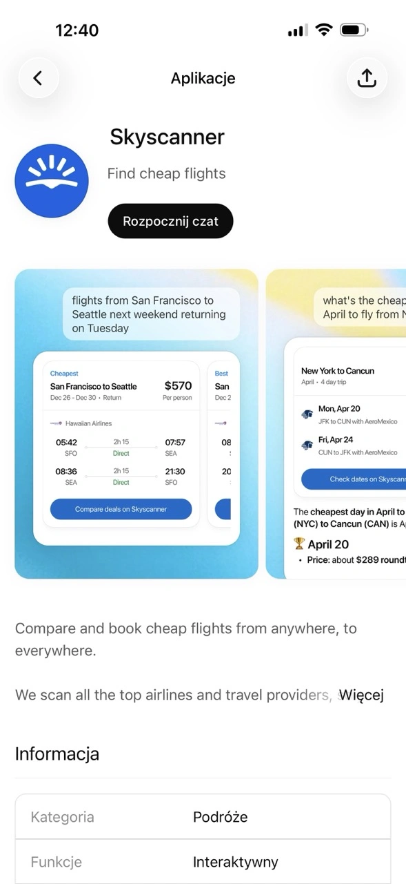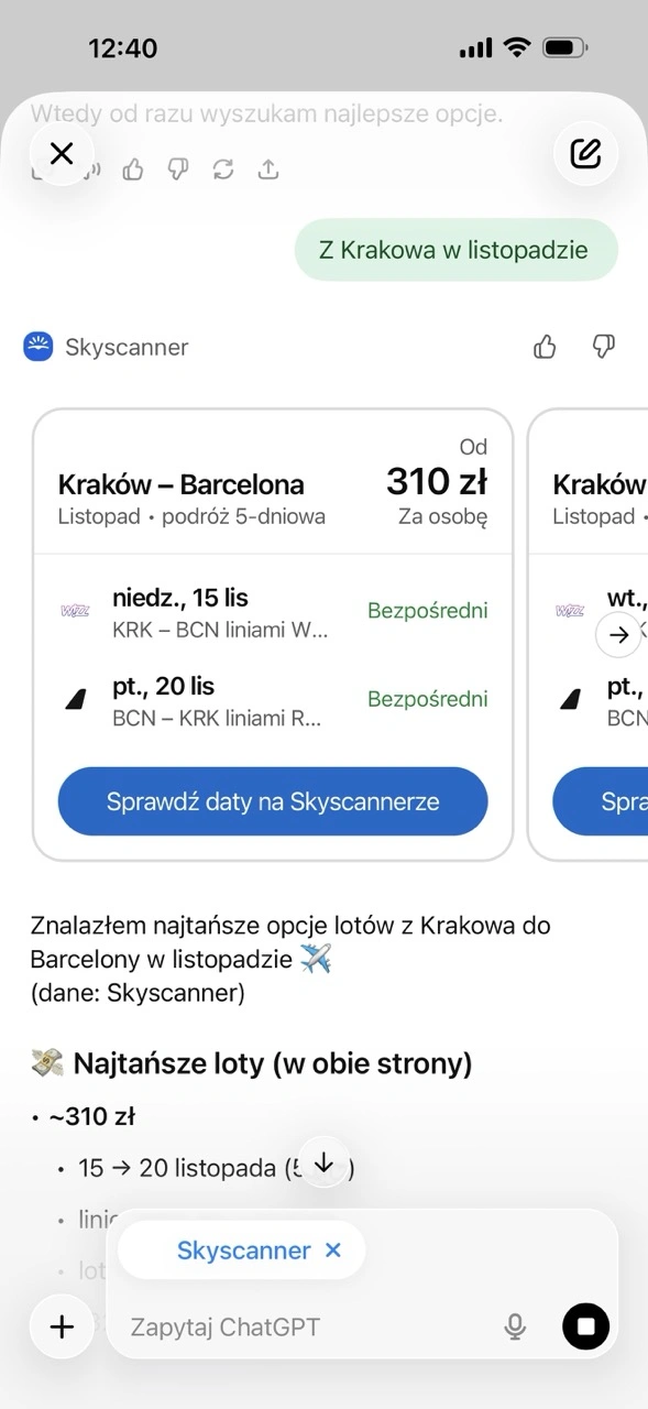 ChatGPT dla wielu osób staje się dziś konkurentem dla wyszukiwarki internetowej Google, dlatego integracja Skyscannera wygląda naprawdę na przydatną. Polecam sprawdzić to rozwiązanie przy planowaniu najbliższego urlopu.
