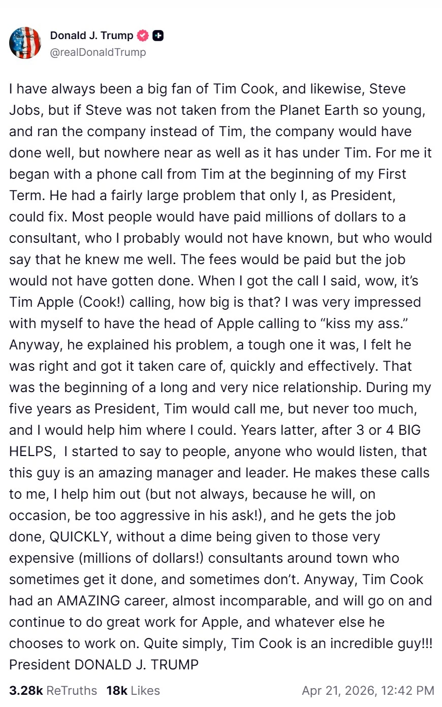 Kluczowy fragment brzmi tak: Tim Cook dzwoni do Trumpa na początku jego pierwszej kadencji. Ma „dość duży problem, który tylko on, jako prezydent, mógł rozwiązać”. Zwykli śmiertelnicy płaciliby miliony konsultantom, którzy „twierdziliby, że go znają”, ale nic by nie załatwili. Trump odbiera telefon i - jak sam pisze - jest „bardzo pod wrażeniem samego siebie”, że „szef Apple dzwoni, żeby całować go w dupę”.
