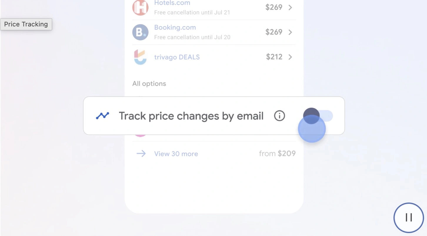 Wpisując frazę "nazwa miasta + hotel" (np. Rzym hotel), Google wyświetla konkretne ceny obowiązujące w poszczególnych obiektach. Rok temu do usługi trafiła opcja ogólnego śledzenia cen. Mogliśmy zaznaczyć chęć otrzymania powiadomienia, jeśli koszt doby spadnie poniżej określonej kwoty.