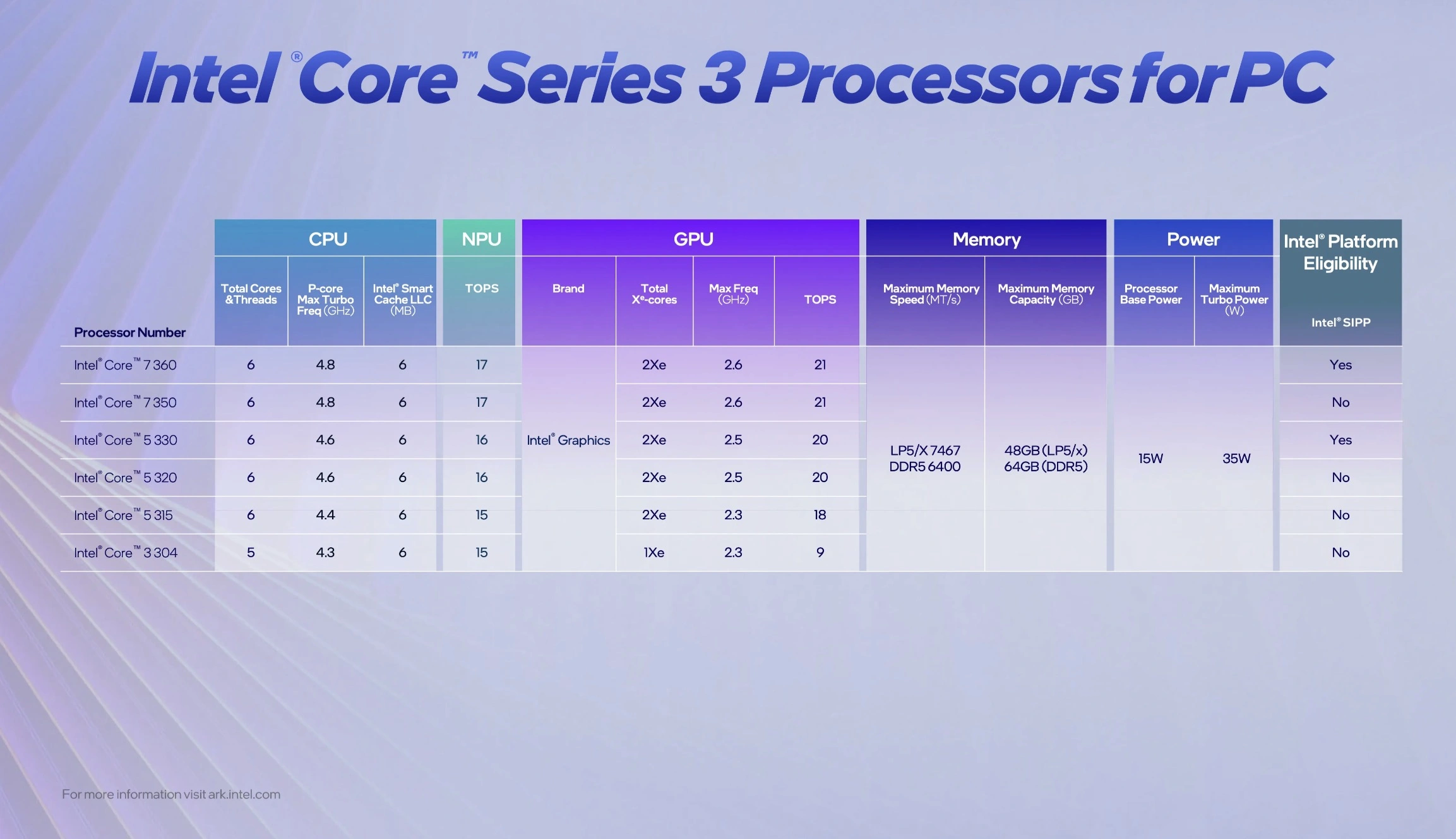 Rodzina Core Series 3 obejmuje sześć układów w różnych konfiguracjach rdzeni i częstotliwości. Najmniej zaawansowany to 5-rdzeniowy (5 wątków) Intel Core 3 304 z podstawowym układem graficznym z pojedynczym rdzeniem Xe, a najbardziej - 6-rdzeniowy (6 wątków) Core 7 360 z dwoma rdzeniami Xe. Tak naprawdę wszystkie czipy poza 3 304 są wyposażone w konfigurację 6 rdzeni i wątków.