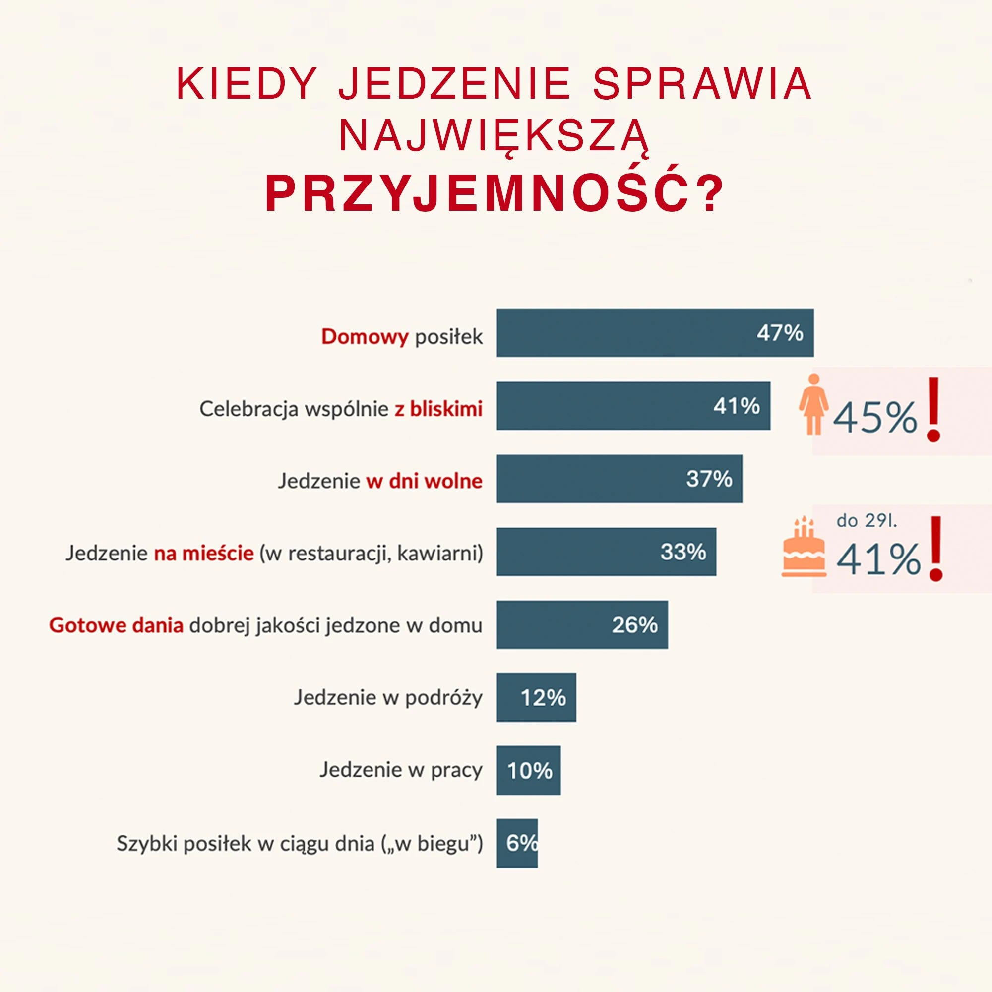 Ważna jest też przestrzeń, w której to doświadczenie się odbywa. Najwięcej przyjemności wciąż daje posiłek jedzony w domu. To w nim najłatwiej o poczucie komfortu. Jednocześnie zmienia się rozumienie samego „domowego jedzenia”. Coraz częściej nie oznacza ono własnoręcznego gotowania, lecz raczej jakość, która może być dostępna bez konieczności spędzania godzin w kuchni. Dla jednej czwartej badanych przyjemność daje spożywanie gotowych, dobrze przygotowanych posiłków w domu, co wskazuje na rosnące znaczenie wygody, która nie musi oznaczać kompromisu.