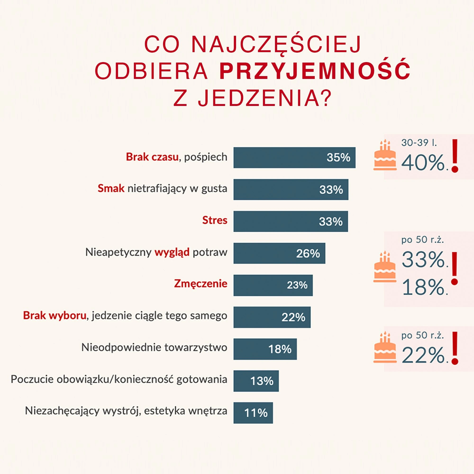 Codzienność, szczególnie w kontekście pracy i obowiązków, często stoi w sprzeczności z deklarowanymi potrzebami. Brak czasu i pośpiech to najczęściej wskazywane czynniki odbierające przyjemność z jedzenia. Paradoks polega więc na tym, że choć jedzenie ma potencjał, by być jednym z najprostszych źródeł dobrostanu, w praktyce czasem bywa spychane na margines.