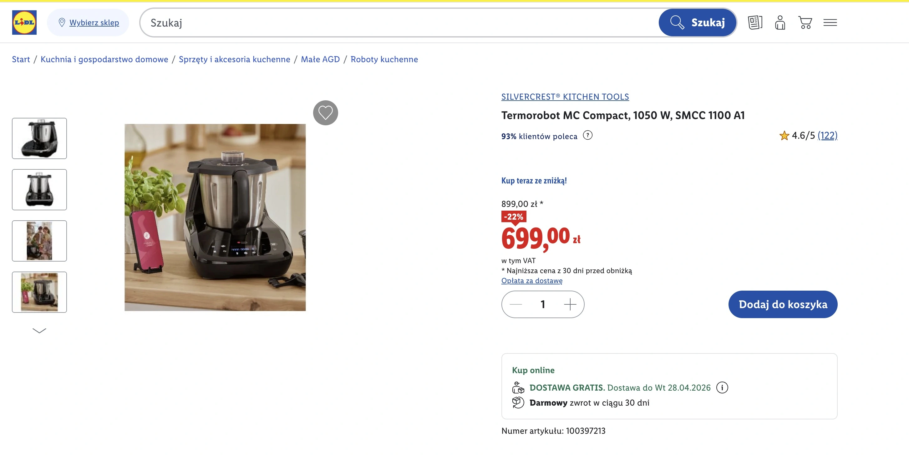 Domyślna cena MC Compact w Polsce to 899 zł. W aktualnej promocji jest jednak dostępny 22 proc. taniej, za 699 zł. To obecnie jeden z najtańszych termorobotów kuchennych na rynku. Odpowiada za niego sprawdzona marka Silvercrest, która ma na koncie mnóstwo przystępnych cenowo sprzętów.