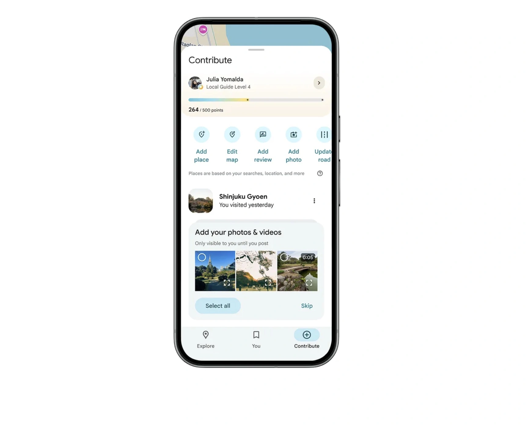 Jeśli użytkownik włączy dostęp do multimediów w Mapach Google w ustawieniach telefonu, zdjęcia i filmy z ostatnich aktywności będą podświetlone bezpośrednio na karcie Dodaj. Oznacza to, że oprogramowanie musi przeskanować zdjęcia z naszej galerii w celu znalezienia najlepszych fotografii.