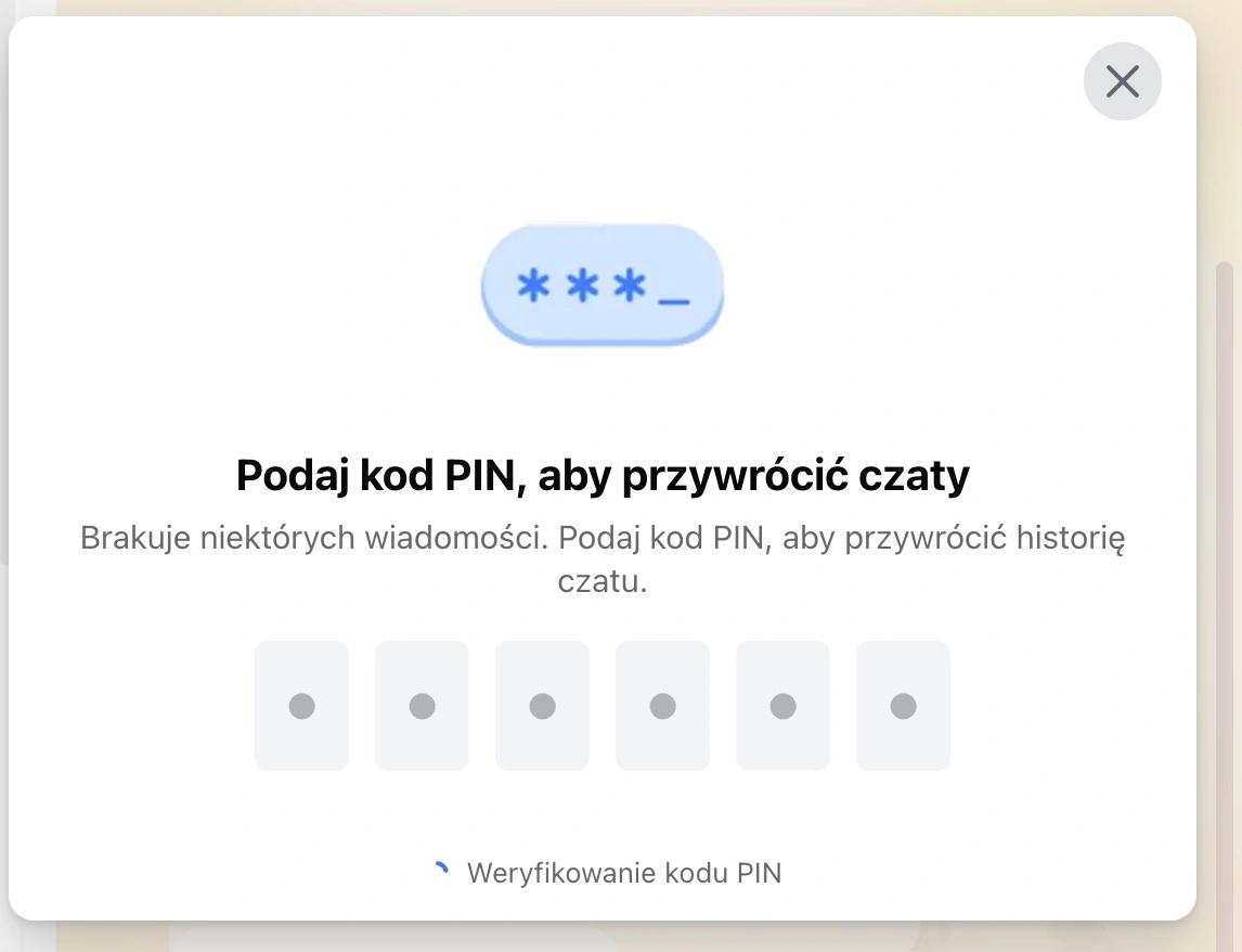 Użytkownik zobaczy komunikat weryfikowanie kodu PIN, który trwa w nieskończoność, lecz bez większych skutków. Brak możliwości weryfikacji oznacza brak dostępu do prywatnych, indywidualnych czatów. Czaty grupowe jednak działają bez większego zarzutu.