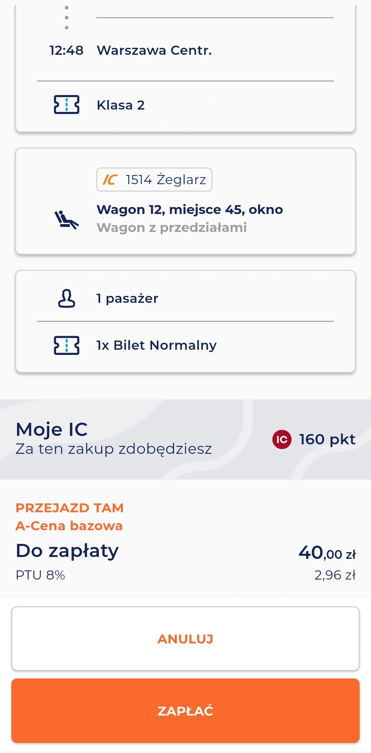 250 za start i łącznie 250 za informacje. Czy to dużo? Za każdą złotówkę wydaną na bilet wpadają 4 punkty. I tak np. wyprawa z Łodzi do Warszawy, wyceniona na 40 zł za bilet w drugiej klasie, przekłada się na 160 punktów. Miło, że przewoźnik wyręcza takie osoby jak ja, które unikają liczenia, i już przy zakupie wejściówki na pokład pokazuje, ile punktów się zdobędzie.