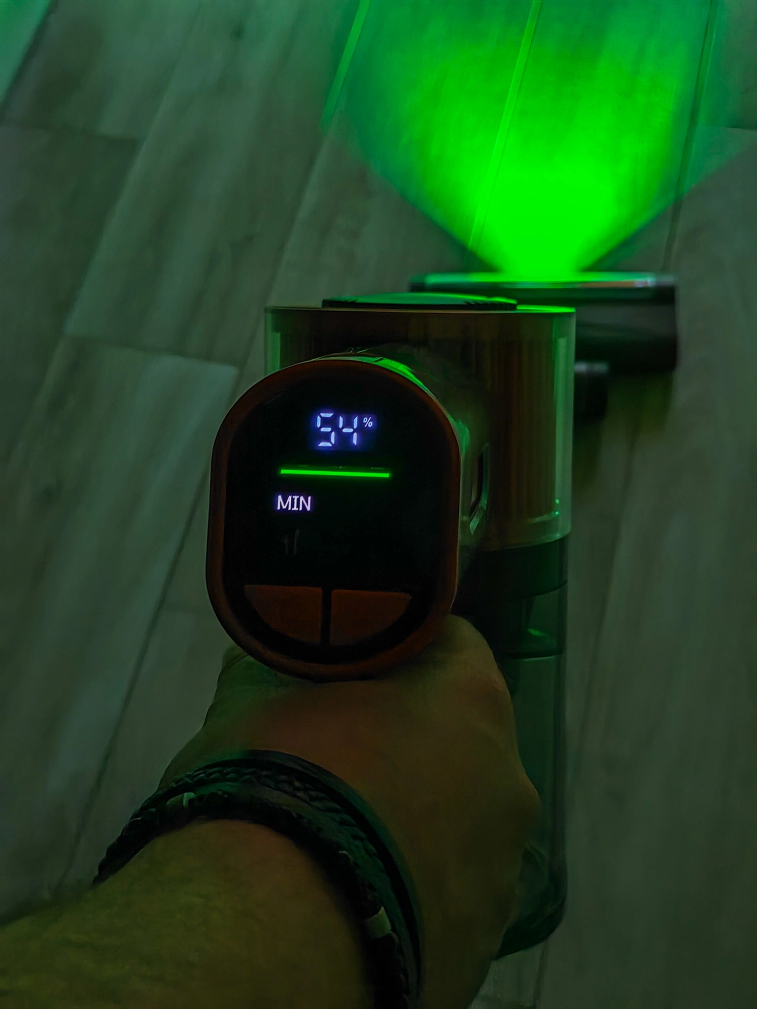 Montaż odkurzacza trwa chwilę i Jigoo C200 jest gotowy do pracy. Według specyfikacji moc ssania to 23 kPa, więc mówimy o naprawdę dużej wartości, zamkniętej w małym i tanim urządzeniu. Włączyłem urządzenie i ruszyłem na odkurzanie. Najpierw podłoga w salonie, która na pierwszy rzut oka wyglądała czysto. Mam jasne panele, nie widać na nich brudu, więc z pomocą przyszła zielona dioda. Potrafi ujawnić kurz, który chowa się przed wzrokiem. Nie miałem dla niego żadnej litości.