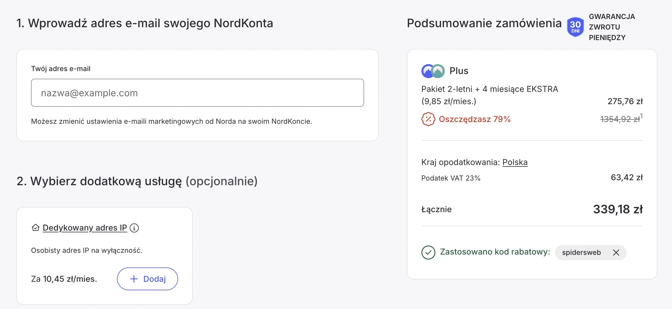 Powyższe stawki dotyczą standardowych pakietów 2-letnich, ale istnieje sprytny sposób, by zyskać aż cztery dodatkowe miesiące subskrypcji zupełnie za darmo. Mianowicie można skorzystać z naszego kodu rabatowego spidersweb. Ten należy wpisać podczas zamawiania konkretnej oferty - w ekranie rozliczenia tuż pod ceną znajdziecie przycisk “Masz kod rabatowy?”. W oknie należy wprowadzić kod, dzięki któremu cena za jeden miesiąc będzie jeszcze niższa.
