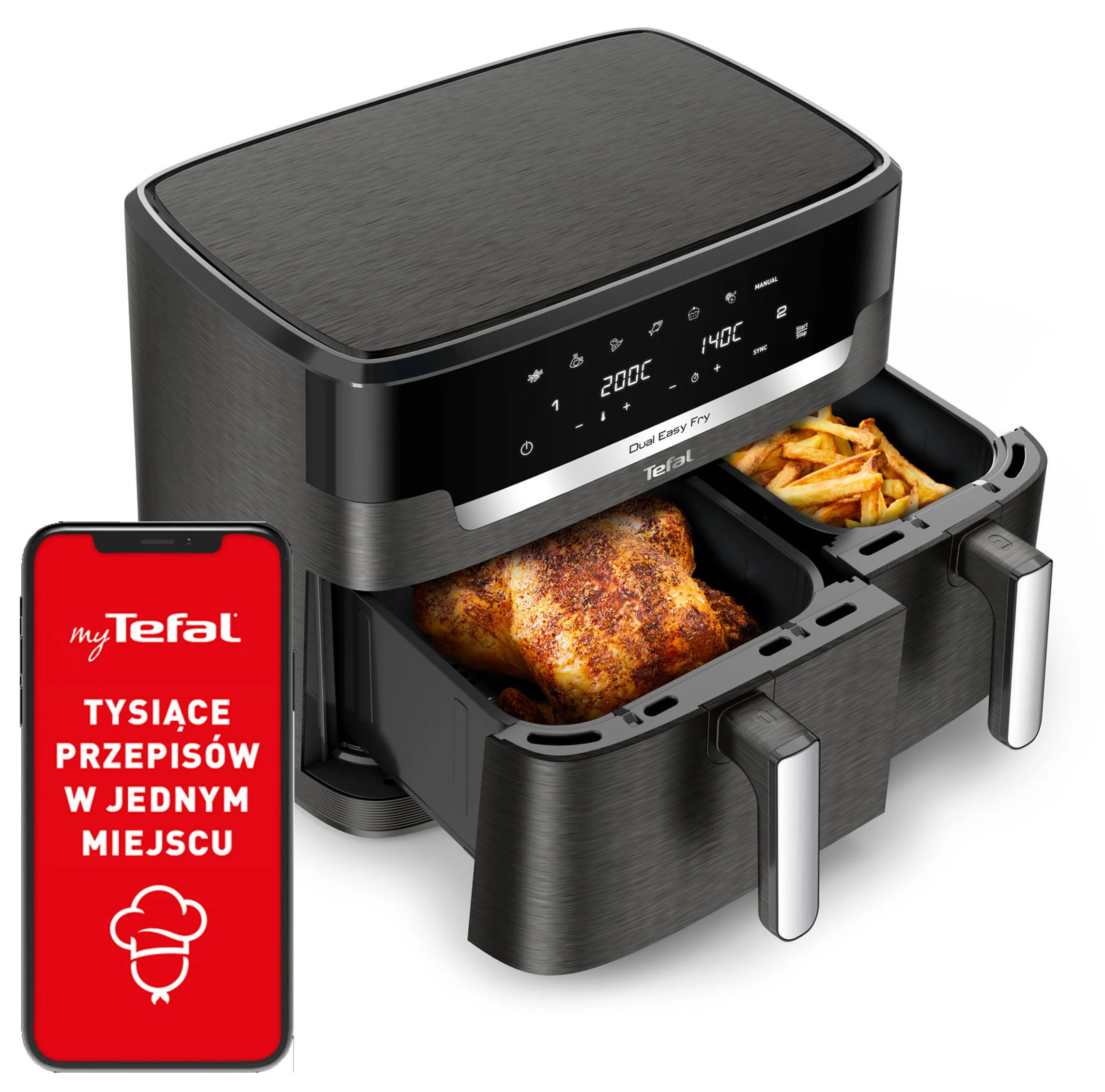Główny atut Tefal Dual Easy Fry XXL to dwie asymetryczne szuflady (duża na danie główne, mniejsza na dodatki), które mają nienagrzewające się rączki i bez problemu wrzucicie je do zmywarki. Dzięki potężnej mocy 2700 W oraz maksymalnej temperaturze 200 stopni pieczenie przebiega błyskawicznie, a cyrkulacja powietrza jest bezbłędna. Dodatkowo producent dorzuca darmową aplikację na iOS i Androida, która posłuży za bogatą bazę gotowych przepisów.