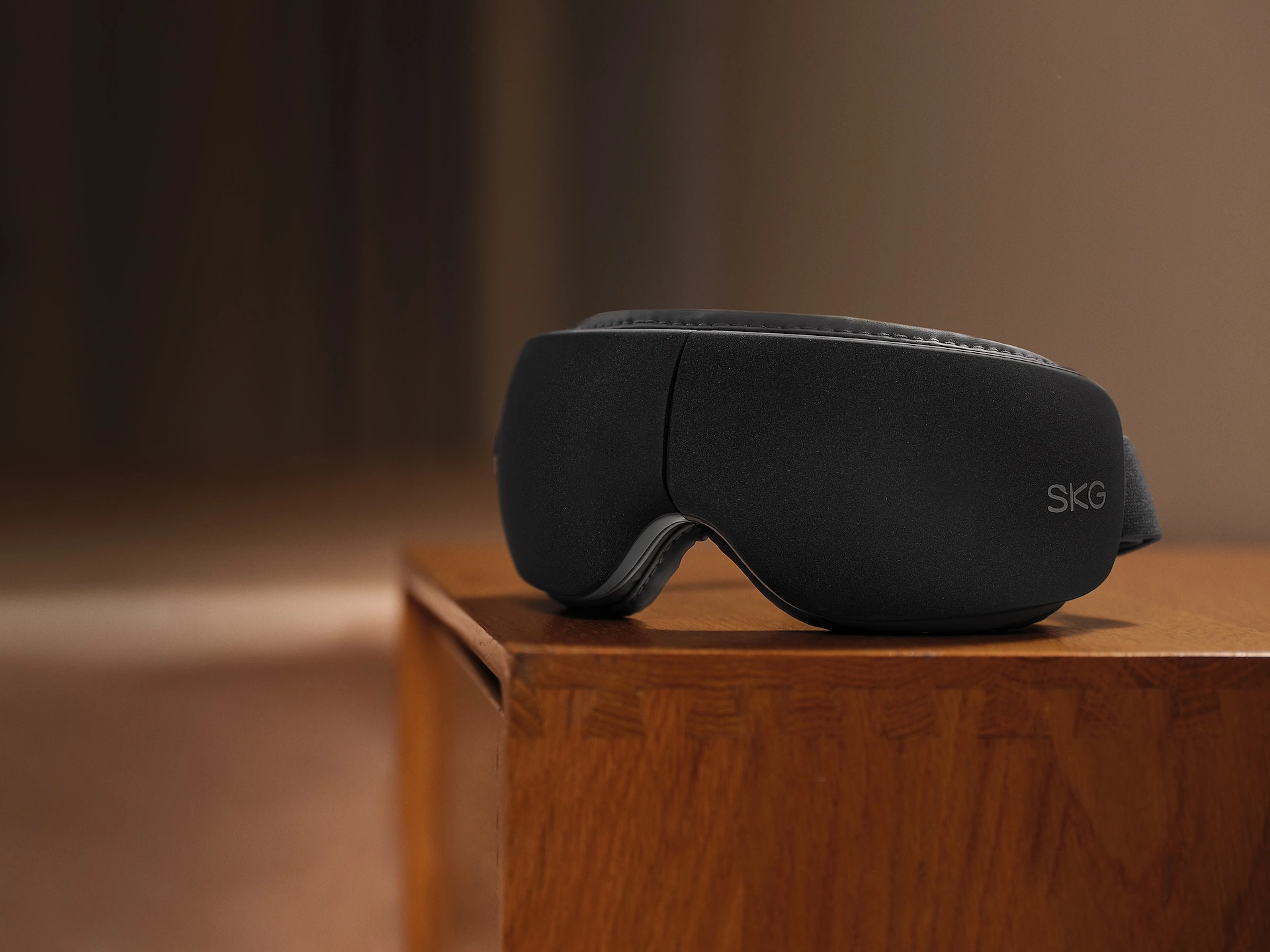 Masażer oczu SKG ES500 to lekkie urządzenie (280 gramów) przypominające gogle VR/AR. Maszyna nie tylko masuje uciskiem poduszek powietrznych, ale też serwuje użytkownikowi ciepły kompres w trzech trybach intensywności. Wisienką na torcie jest opcjonalna sesja audio w trakcie zabiegu, podczas której masażer łączy się ze smartfonem, emitując biały szum. Fale, strumyk, pojedyncze klawisze pianina – użytkownik wybiera, na co ma ochotę.
