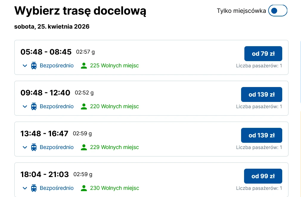 Wyszukując bilet na 16 kwietnia, ceny biletów na ranny wyjazd zaczynają się od 59 zł. Kolejne to wydatek od 99 zł w górę, w zależności od klasy. Dzień później jest to odpowiednio 79 zł i 139 zł.