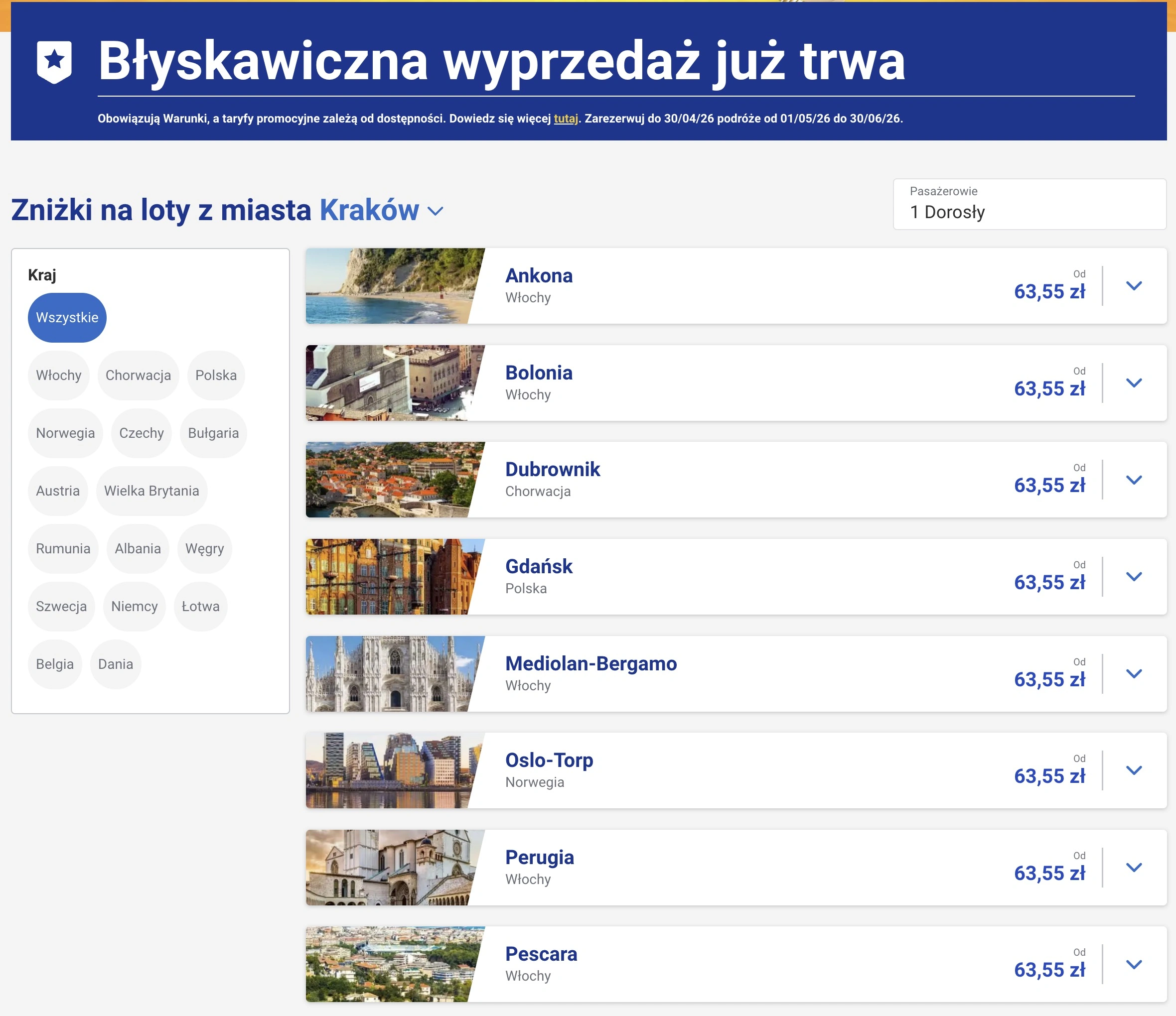 Promocja działa w taki sposób, że ceny biletów zaczynają się od 63,55 zł za jedno połączenie na osobę. Oczywiście są to najniższe możliwe wartości – wciąż znajdziemy bilety za ok. 95 czy 120 zł (a nawet droższe). Dużo zależy od wybranego lotniska, daty oraz połączenia. Klienci mogą wybierać spośród kilku lotnisk w całym kraju: