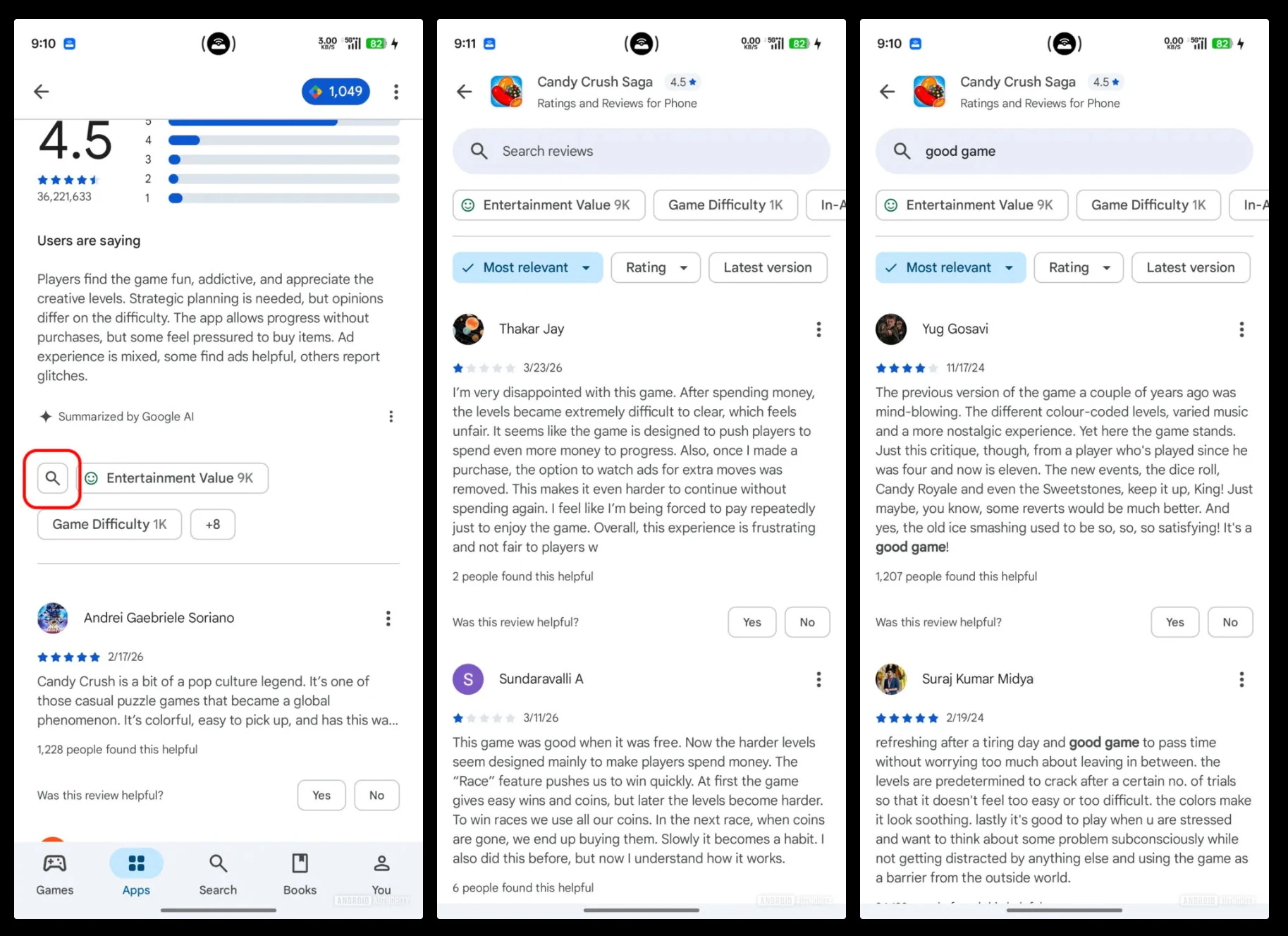Wpisujesz kilka słów, naciskasz przycisk szukania na klawiaturze i… zamiast losowej mieszanki zachwytów i hejtu dostajesz listę opinii, w których pojawia się podany przez ciebie zwrot. Chcesz sprawdzić, czy w darmowej grze „nie ma za dużo reklam”? Możesz spróbować fraz typu „za dużo reklam”, „too many ads”, „no ads”. Interesuje cię „battery drain”, „bugi po ostatniej aktualizacji”, „crash on start”? To wszystko da się teraz wyłuskać z tłumu.