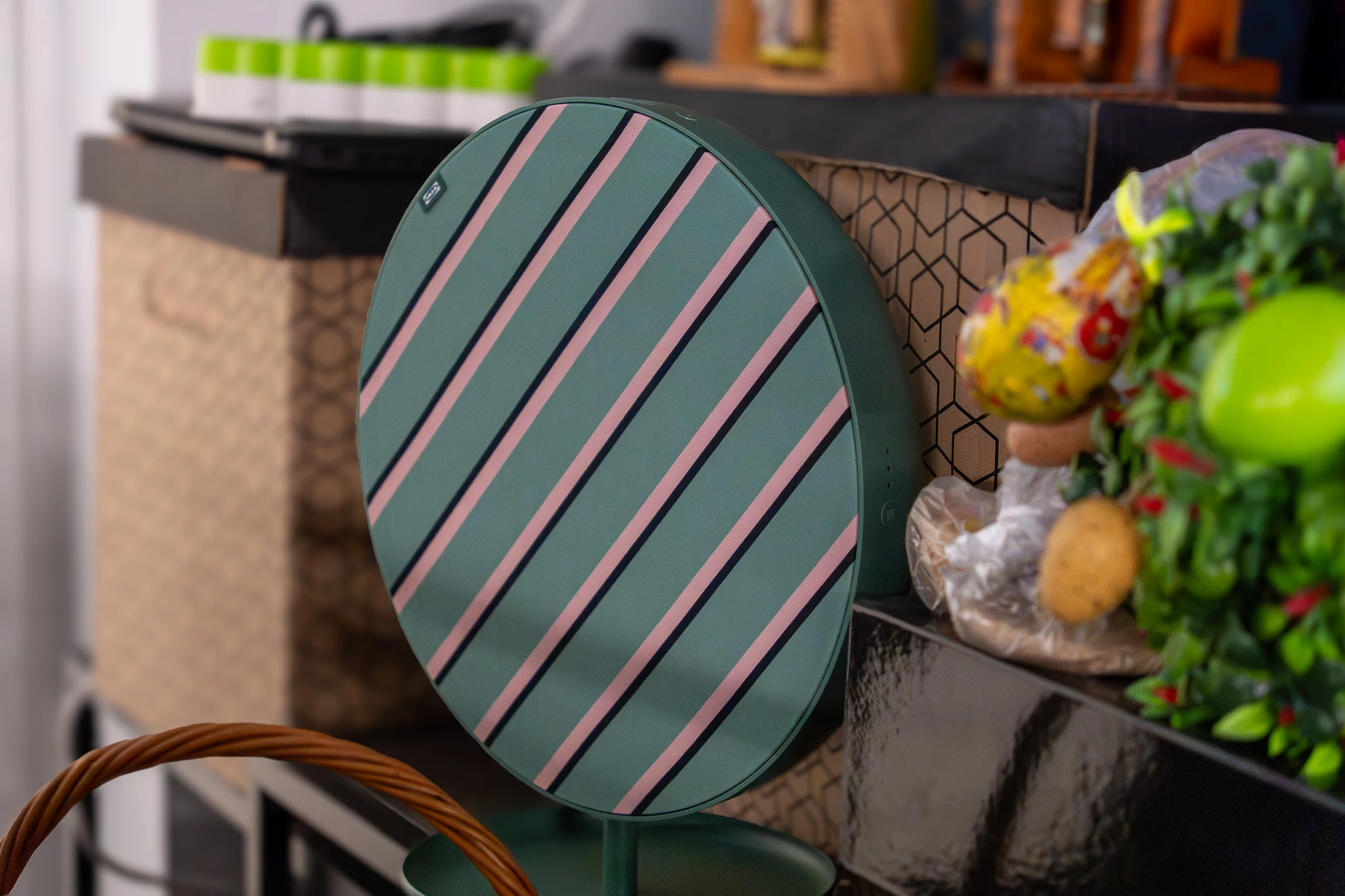 Patrząc na niego w salonie, widzę raczej płaski, tekstylny krążek niż klasyczny „sprzęt audio”, który zazwyczaj trzeba upychać gdzieś pod telewizorem lub chować za zasłoną. Średnica 29 cm (są dostępne wersje 19 i 45 cm) i dość głęboka obudowa sprawiają, że zawieszony na ścianie wygląda trochę jak dekoracyjny talerz, a postawiony na półce - jak nowoczesny, designerski panel, który przez czysty przypadek dostał kabel zasilający. I wszystko za 249 zł. To prawdopodobnie pierwszy głośnik w moim domu, którego naprawdę nie mam najmniejszej ochoty chować przed wzrokiem gości.