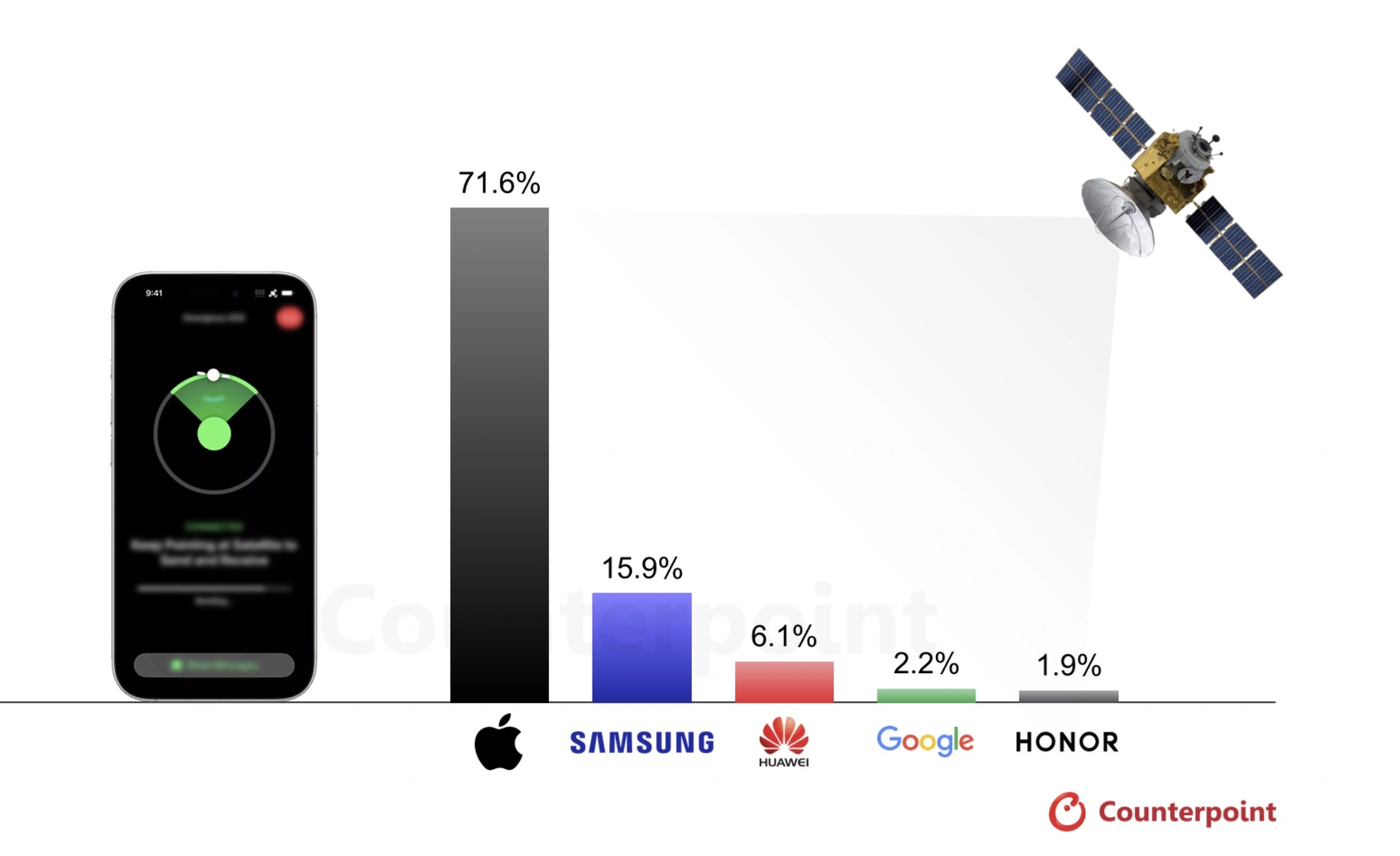Według najnowszych danych Counterpoint Research obecnym liderem na rynku smartfonów z obsługą łączności satelitarnej jest Apple. Producent iPhone’ów odpowiada bowiem za 71,6 proc. wszystkich takich urządzeń. Na drugim miejscu znajduje się Samsung z wynikiem 15,9 proc., a podium zamyka Huawei z udziałem na poziomie 6,1 proc. Google i Honor łącznie mają pozostałe 4,1 proc.