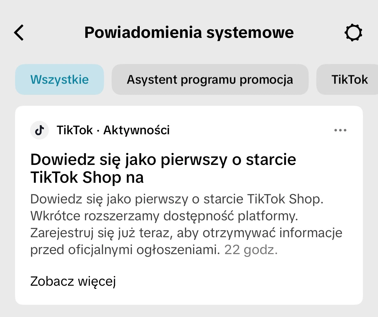 Natomiast dziś rano na jeden z naszych redakcyjnych smartfonów dotarło powiadomienie z aplikacji TikTok informujące o spodziewanym starcie TikTok Shop w Polsce. Kliknięcie w powiadomienie nie zdradza nowych informacji, a jedynie przekierowuje do specjalnego formularza.