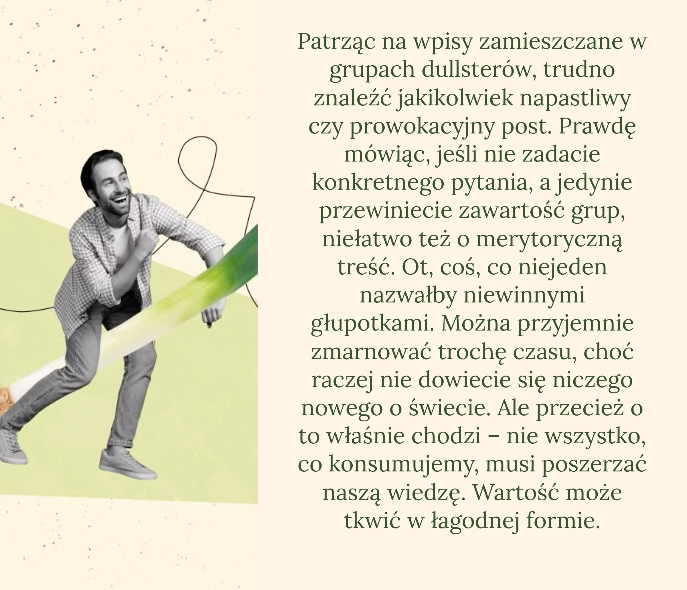 Grupa zupełnie niezamierzenie stała się przestrzenią do wyciszenia i odpoczynku od informacyjnego chaosu, ale też od werbalnej agresji. Zaczęła przyciągać tych, którzy szukają miejsca do rozmów – często o niczym – i dzielenia się przemyśleniami. Tych, którzy tęsknią za starym internetem, trącącym może nieco bumerszczyzną, w którym taką funkcję pełniły blogi i fora.