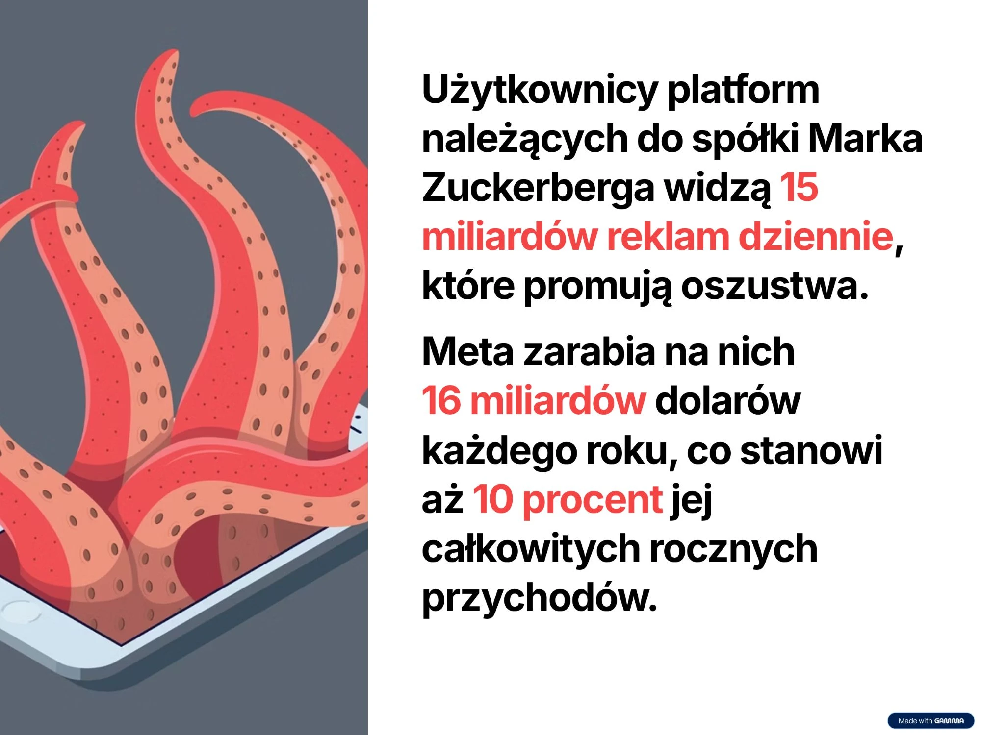 – To pokazuje patologię w działaniu Mety, bo okazuje się, że kierownictwo firmy doskonale wiedziało, że daje przestrzeń na niezgodne z prawem działania, świetnie na tym zarabia i co gorsza świadomie oraz celowo niewiele z tym zrobi, bo jej się to zwyczajnie opłaca – mówi Piotr Mieczkowski i przypomina, że Reuters ustalił też, że amerykańska firma co najmniej od 3 lat nie radzi sobie z procederem oszustw.