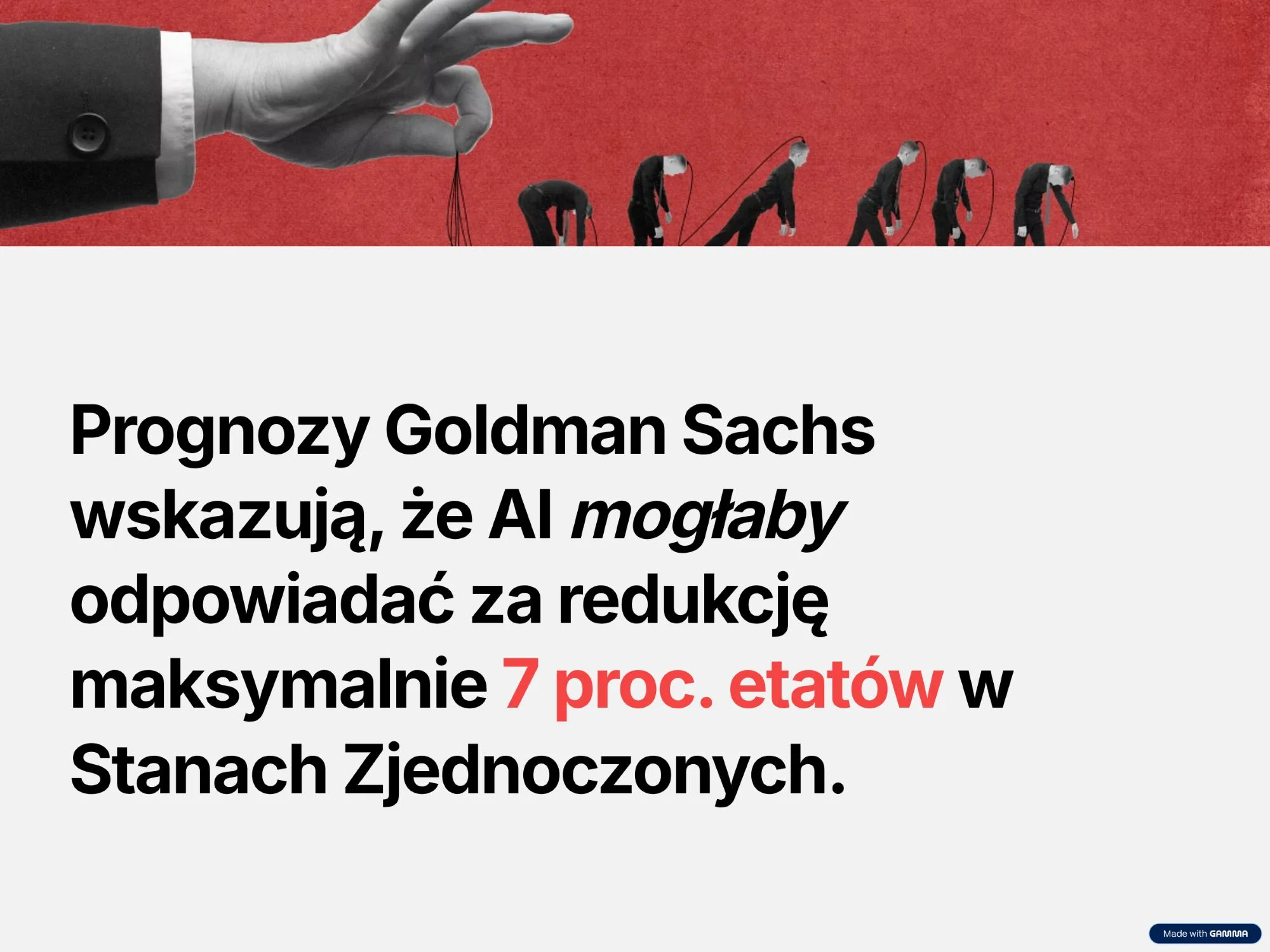Pomijając fakt, że te szacunki wyglądają, jakby ich źródłem był Instytut Danych z Dupy, to nawet biorąc je na poważnie, trudno znaleźć dla nich potwierdzenie w badaniach. Prognozy Goldman Sachs wskazują, że AI mogłaby odpowiadać za redukcję maksymalnie 7 proc. etatów w Stanach Zjednoczonych. Z kolei badacze z Yale podkreślają, że jak dotąd nie obserwujemy realnej redukcji zatrudnienia, lecz raczej zastępowanie jednych stanowisk innymi.